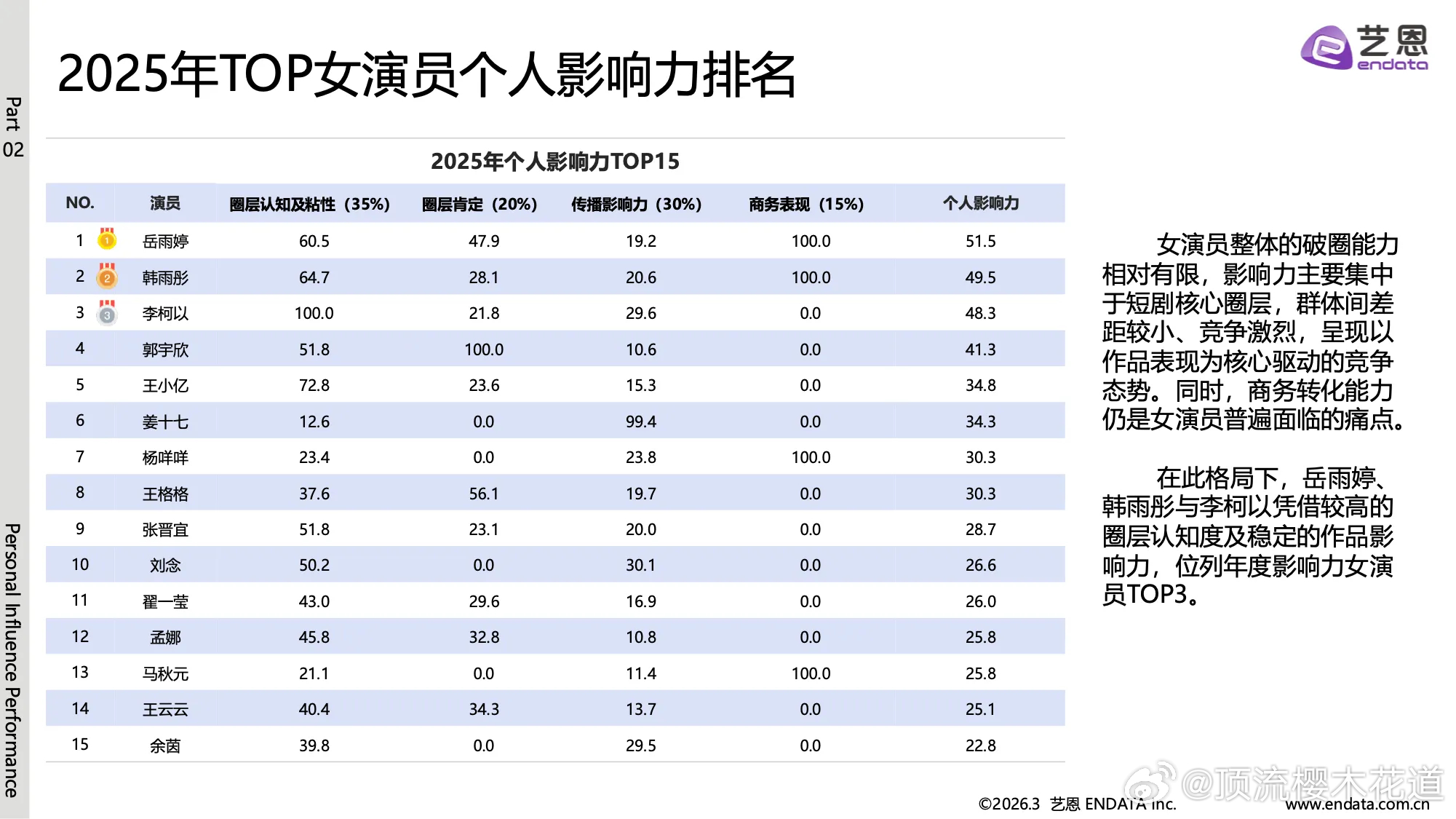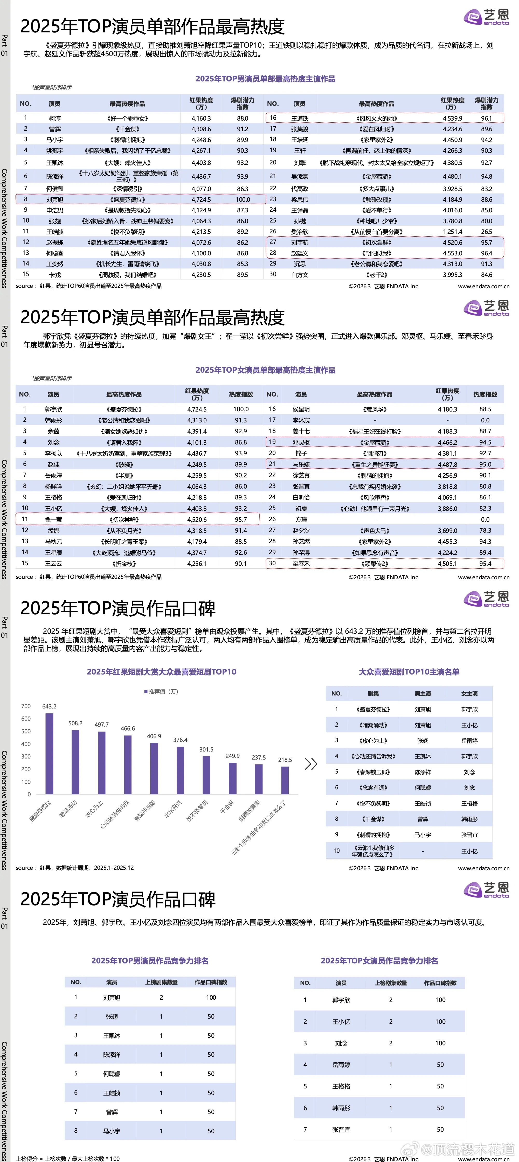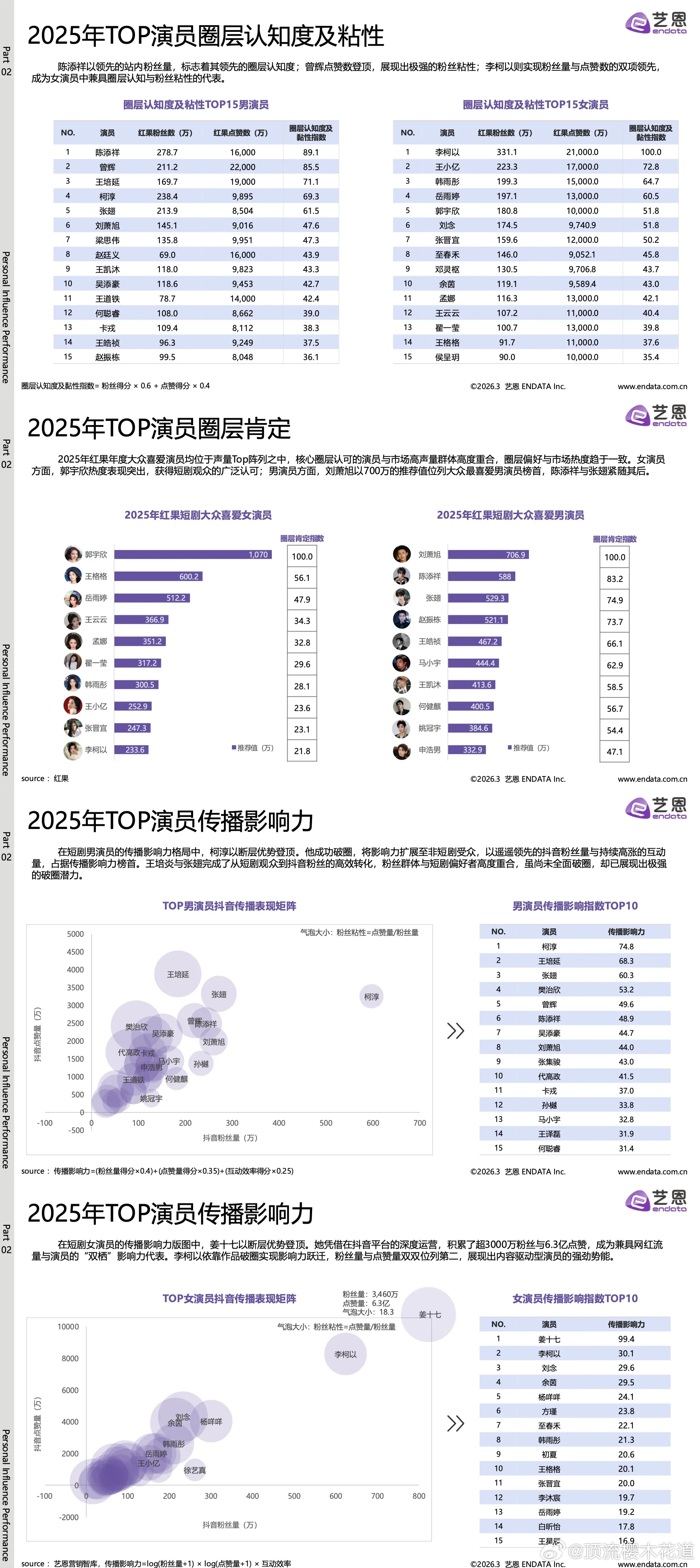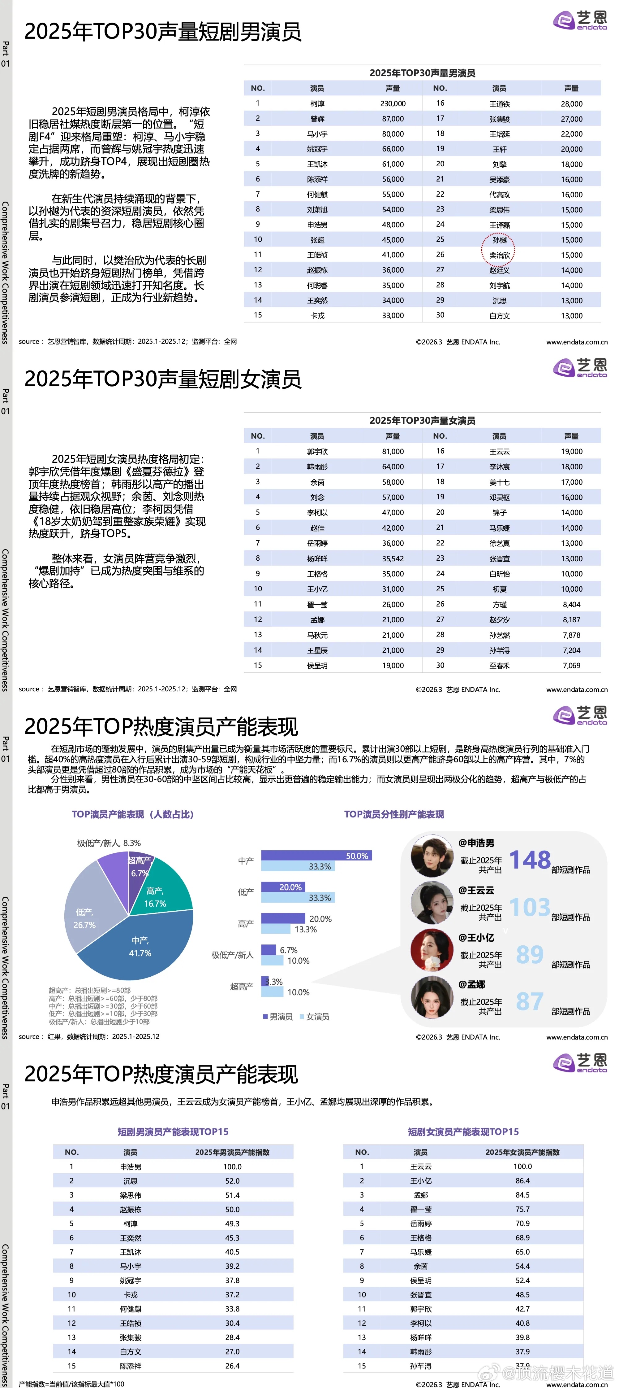 2025-2026短剧演员商业价值热度报告头部男演员前五陈添祥 曾辉 刘萧旭 柯淳 张翅头部女演员前五韩雨彤 郭宇欣 王小亿 岳雨婷 李柯以也算符合体感吧,短剧头部演员现在的流量也相当于次顶流了吧?
