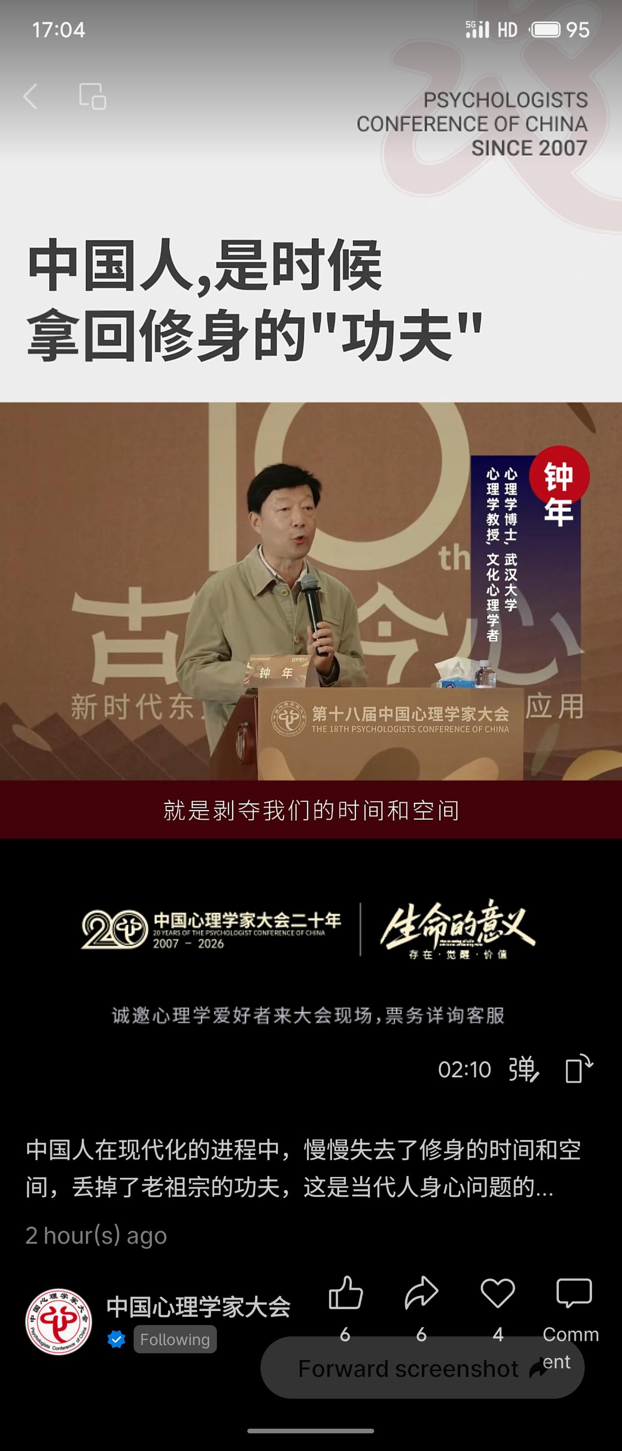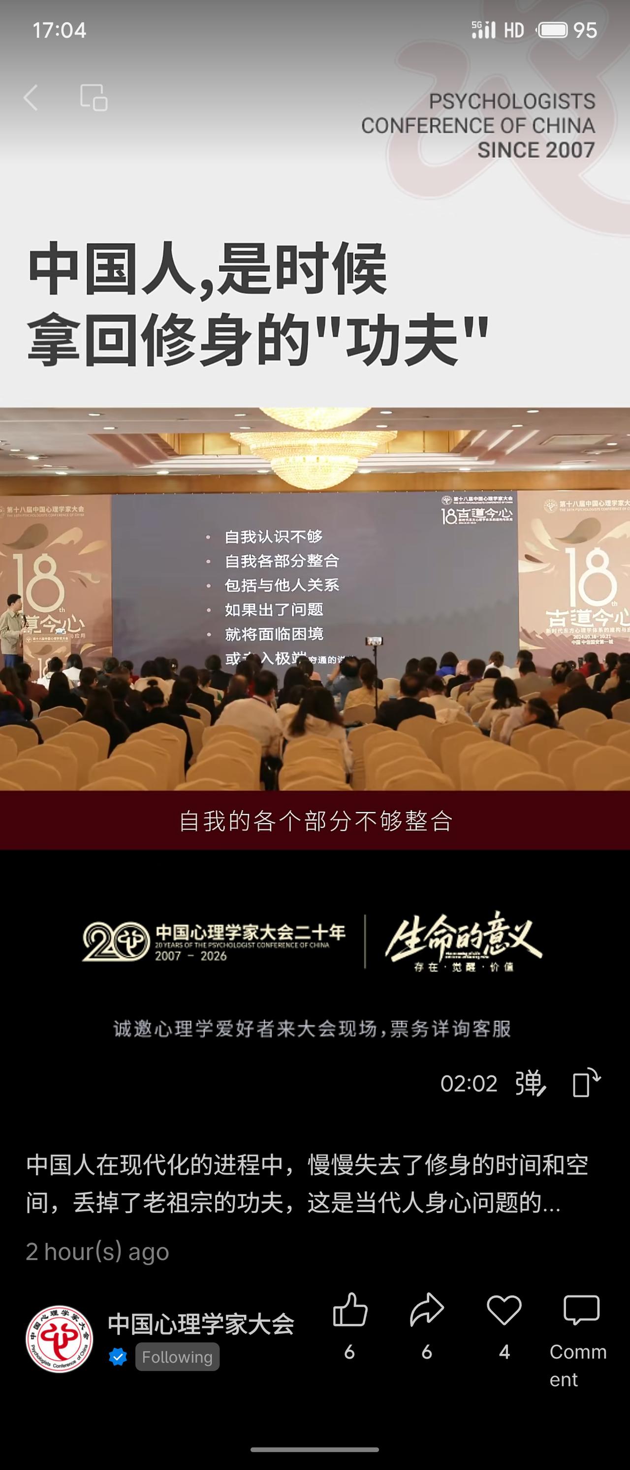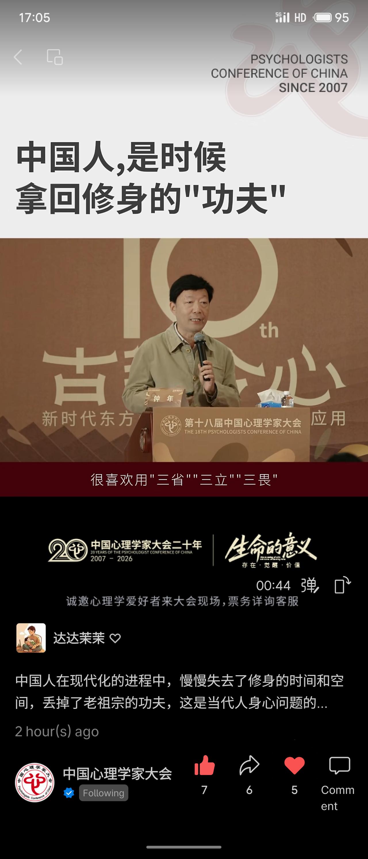 在第18届中国心理学家大会上,演讲者武汉心理研究中心主任钟年教授围绕“中国人,是时候拿回修身的‘功夫’”展开。他指出,现代化进程中人们逐渐失去了修身的时间与空间,丢掉了传统智慧,这是当代身心问题的根源。演讲将中国传统的“修身”理念与心理学的“自我”概念相贯通,强调需认识并整合身体我、心理我、社会我等自我的不同部分。 该演讲试图在心理学框架下激活传统文化资源,回应现代人因自我割裂与意义缺失而产生的精神困境,体现了本土心理学对“返本开新”的探索。