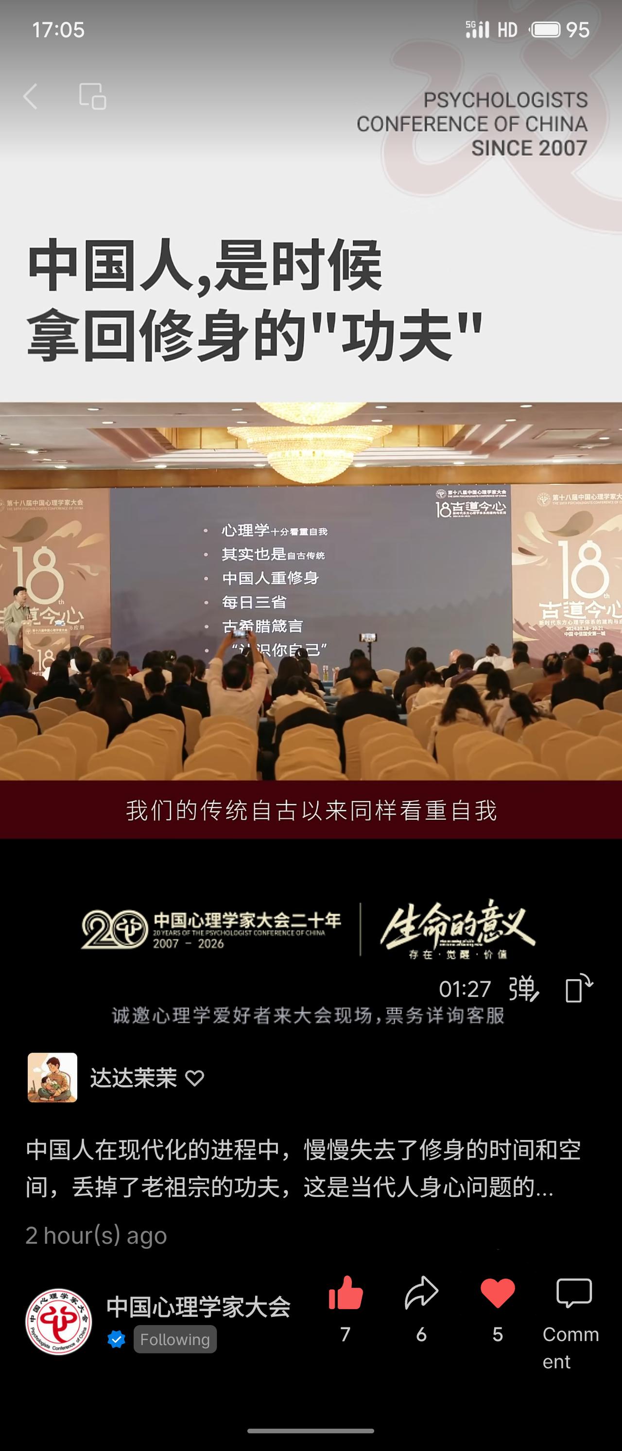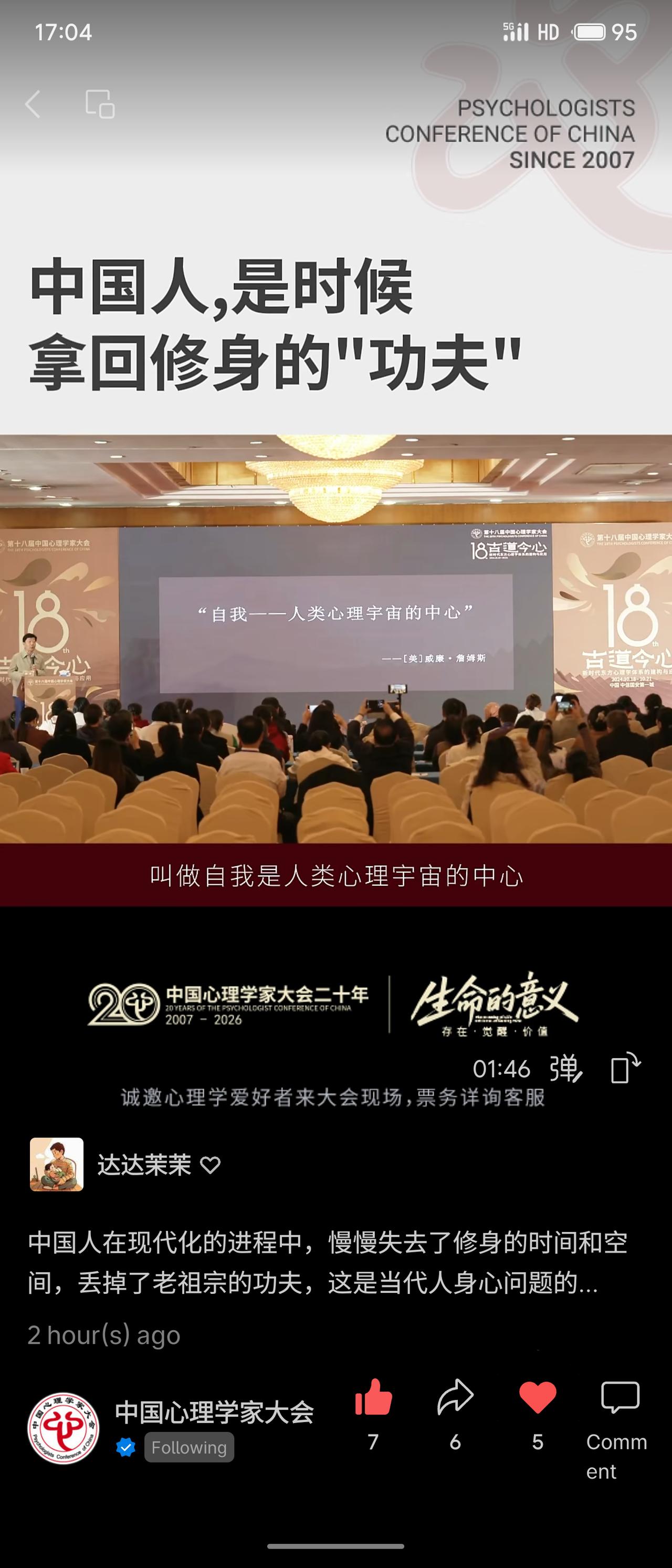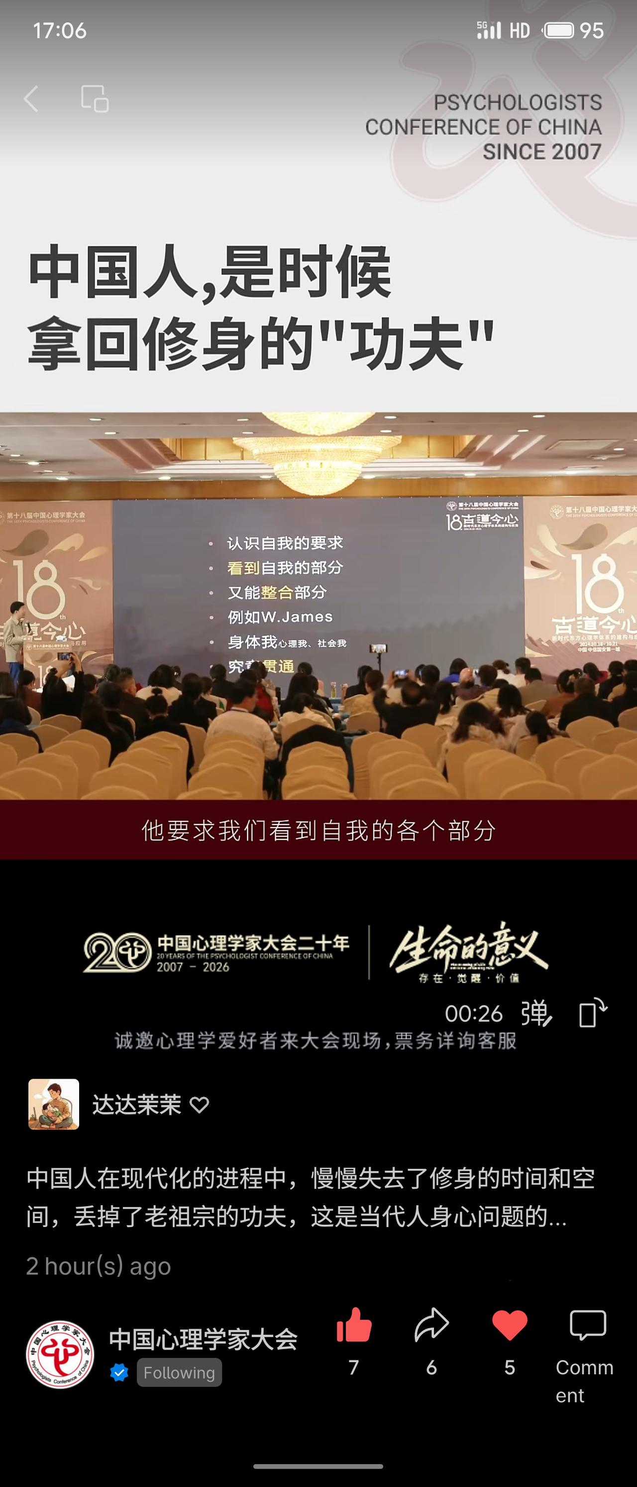 在第18届中国心理学家大会上,演讲者武汉心理研究中心主任钟年教授围绕“中国人,是时候拿回修身的‘功夫’”展开。他指出,现代化进程中人们逐渐失去了修身的时间与空间,丢掉了传统智慧,这是当代身心问题的根源。演讲将中国传统的“修身”理念与心理学的“自我”概念相贯通,强调需认识并整合身体我、心理我、社会我等自我的不同部分。 该演讲试图在心理学框架下激活传统文化资源,回应现代人因自我割裂与意义缺失而产生的精神困境,体现了本土心理学对“返本开新”的探索。
