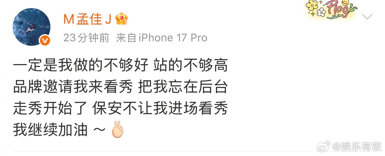 孟佳受邀看秀被保安阻止进场孟佳 是我站的不够高 孟佳发博分享看秀经历:“品牌邀请