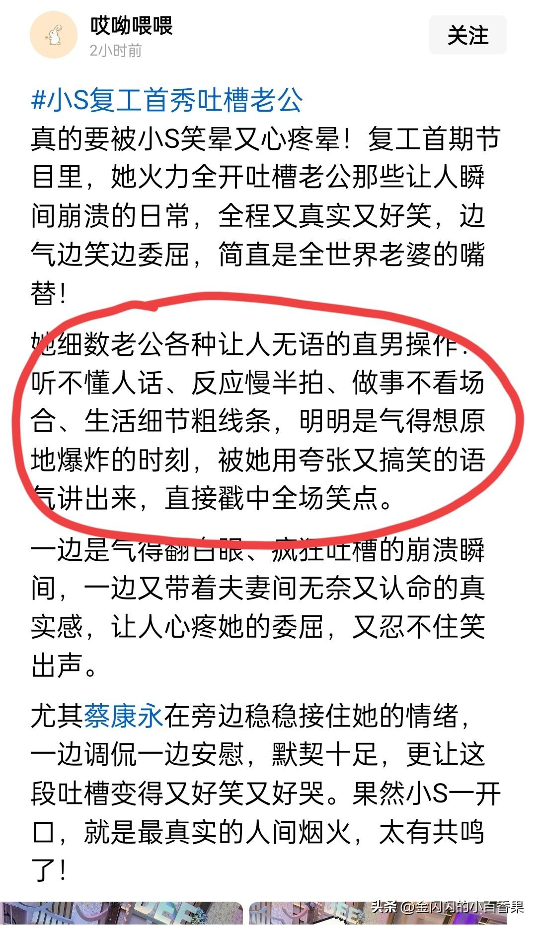 小s拿“真性情”当才华,马筱梅扯下她“没本事”的遮羞布,要不得现在看见她网友就讨厌,看见马筱梅就疯狂关注,本质人们都慕强。你看好不容易出来的小s,还是老把戏,都用了几十年了,自己不吐别人都烦了,好吗。最近看热搜看得真的心累,一边是小S在节目里把老公吐槽得千疮百孔,卖惨卖笑博眼球;朋友全出动,效果一拉再拉。再看另一边是马筱梅三言两语就把家庭关系处理得滴水不漏,岁月静好还能为自己争得漂亮,观众分分为其宣传。现在网友吵翻了天,有人共情吐槽,有人夸赞清醒。但翻来覆去去看,我只想说一句大实话:别把没有能耐,当成“真性情”的借口。观众的眼睛是雪亮的。 小S的吐槽,初看是“人间真实”,细数老公直男操作、听不懂人话、不看场合、粗线条,听着解气,听着好笑,听着也让人委屈。但仔细琢磨,这本质上是什么?是一种低维度的宣泄。明明是生活中早已存在的矛盾,是本该解决的相处难题,她选择把它搬上舞台,变成一场边哭边笑的脱口秀。 这何尝不是一种内耗?把一地鸡毛抖给观众看,看似赢了吐槽,实则输了格局。当抱怨和卖惨成为一种习惯,所谓的“直爽”就变了味,那是拿嘴硬掩饰无能,拿吐槽逃避责任。日子是过出来的,不是吐槽出来的。你把老公说得一无是处,把生活说得鸡飞狗跳,除了博一时眼球,除了宣泄那点无处安放的焦虑,还能留下什么? 反观马筱梅,为什么她赢麻了?不是因为她完美,而是因为她懂规矩、有格局、情绪稳定。面对复杂的家庭局面,她不嘴碎、不抱怨、不把伴侣当小丑公开处刑。她说话有分寸,办事有力度,哪怕是争福利,也是站在为自己、为孩子谋未来的高度,体面又漂亮。 这不是什么“贤妻良母”的刻板印象,这是成年人的顶级情商。婚姻是什么?是合作,也是修行。伴侣不是你的情绪垃圾桶,更不是你用来博取流量的道具。能把日子过顺,能把情绪压稳,能在矛盾中寻求共赢,这才叫能耐。 现在的舆论风向,早就不再吃“我很惨所以我有理”那一套了。大众厌倦了一地鸡毛,更欣赏的是包容、智慧、能扛事的大女主。大家反感的从来不是抱怨生活,反感的是把无能当个性,把烂嘴当直率。 把没有能耐,包装成真性情;把脾气坏,美其名曰不装。 这种虚伪,大家看得清清楚楚。 生活里,最掉价的行为,就是一边喊着累,一边还把烂摊子甩给别人收拾。 真正的强者,从不屑于在公开场合贩卖焦虑,也不懂得把脆弱当武器。他们关起门来解决问题,敞开门厅展示生活。 千言万语,最后就落这一句:**别拿没有能耐当借口,没本事就是没本事,别再拿“性格”来洗了!**💥