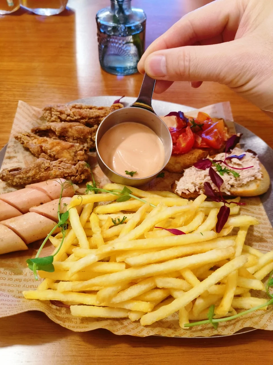 这个菜是为选择困难症而设的地道小吃,能一次过品尝到多种法式小吃,甘香的鸡翅,咸香的薯条,有嚼感的香肠,骚脆的法式餐包等