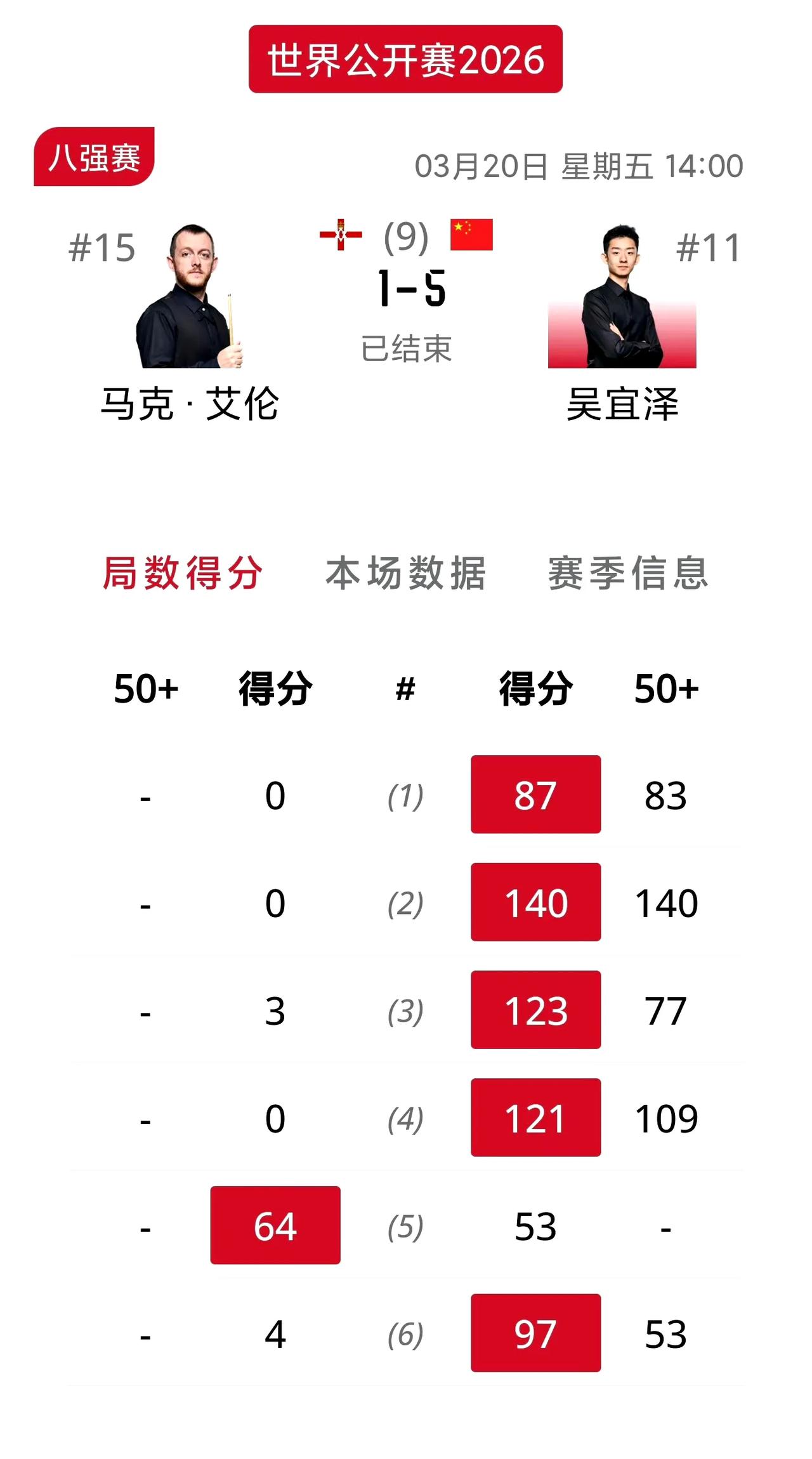 奥沙利文吴宜泽会师半决赛!火箭这状态还是人吗?完全是非人类表现,单杆153分创造记录,至少短期内无人能够打破,连续五杆终结比赛。吴宜泽同样表现完美,艾伦昨天5:0拿下周跃龙今天同样被5:0打败,印证了那句话出来混迟早要还的,两人状态都好,明天的半决赛有好戏看了,谁能赢球,冠军希望更大[赞]