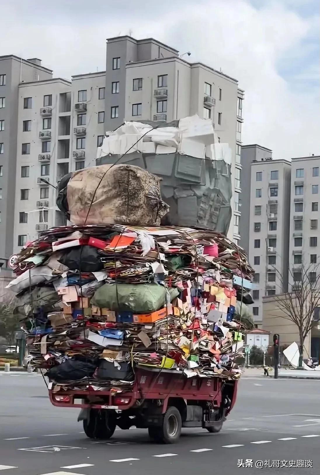 这是我见过装货最厉害的人。一个小小的电动三轮车,装了一层又一层,层上加层,我在想他是怎么装上去的,还装的那么牢固,没有倒下来。他这一车装的货比别人两车三车都多。我在想,他装这么满,走到路上,会不会有人拦着不让走?