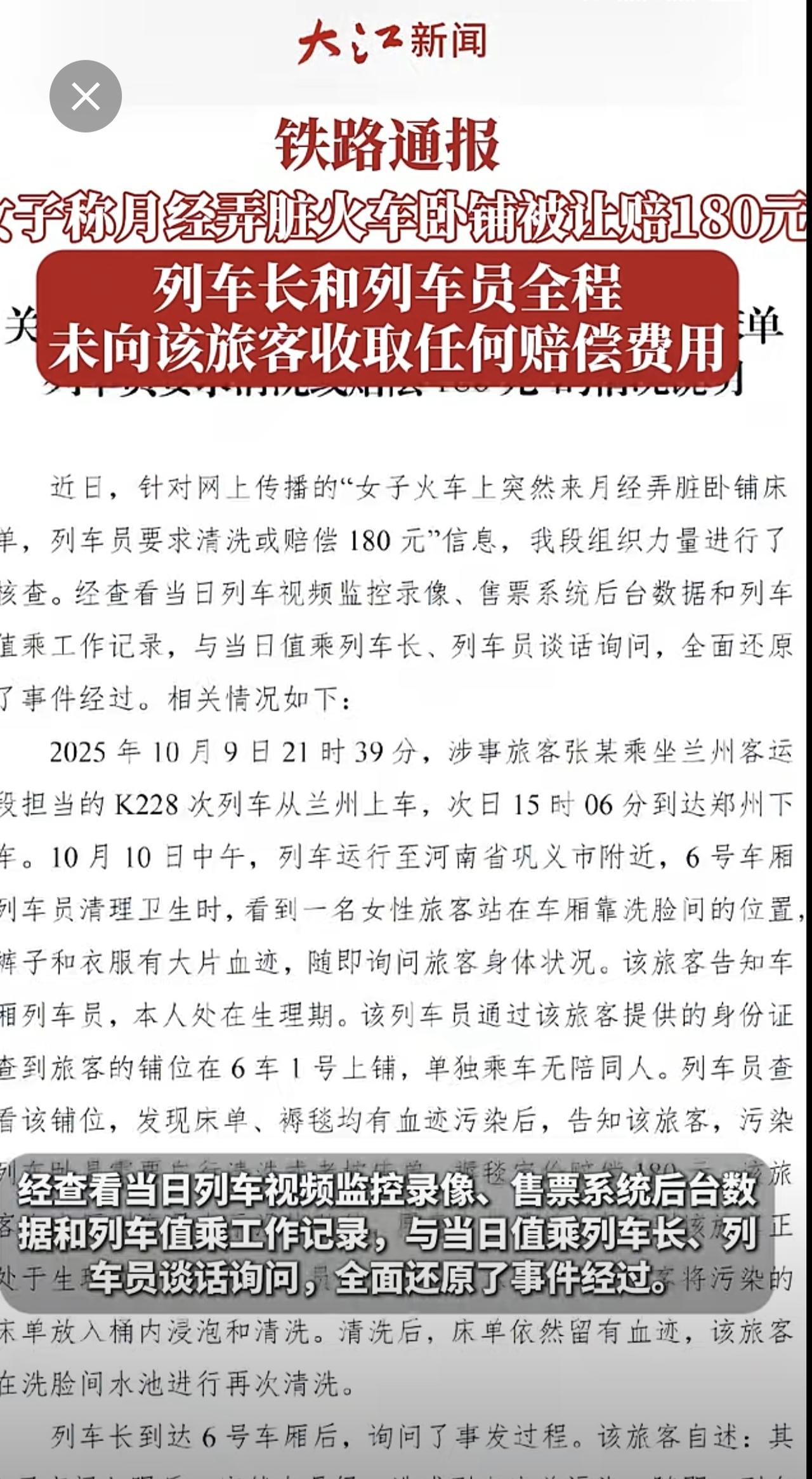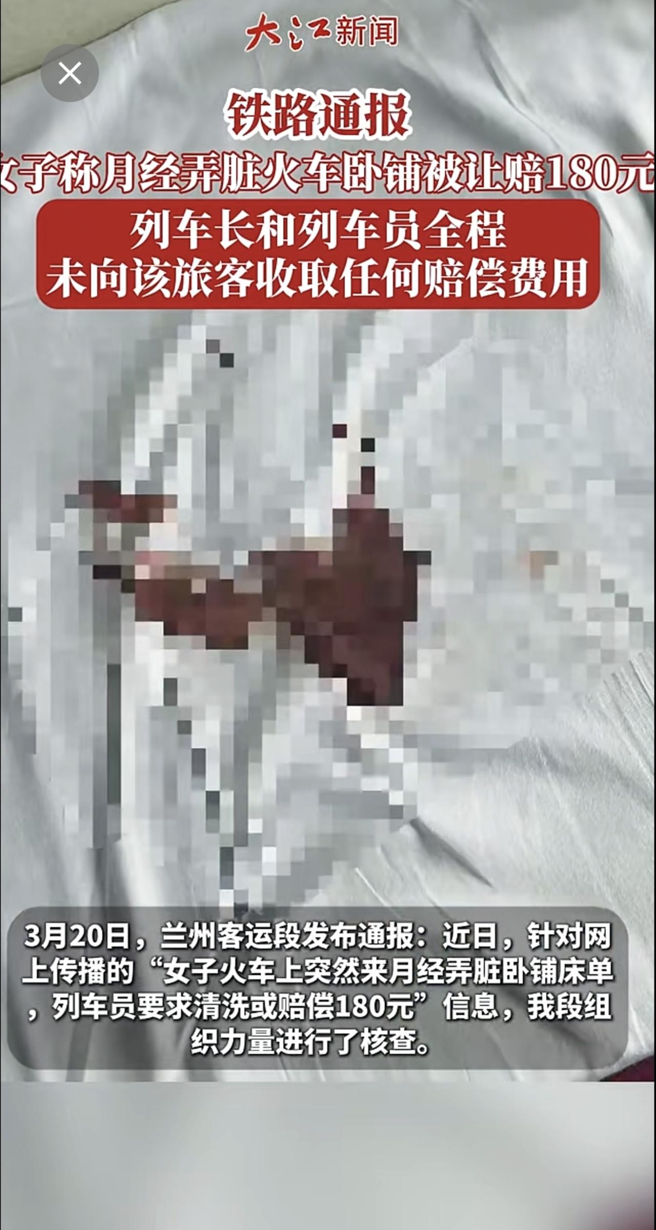 铁路通报“女子称月经弄脏火车卧铺被让赔180元”:列车长和列车员全程未向该旅客收