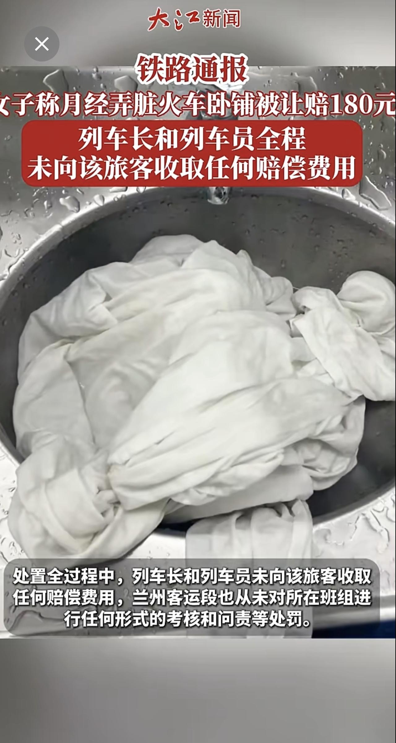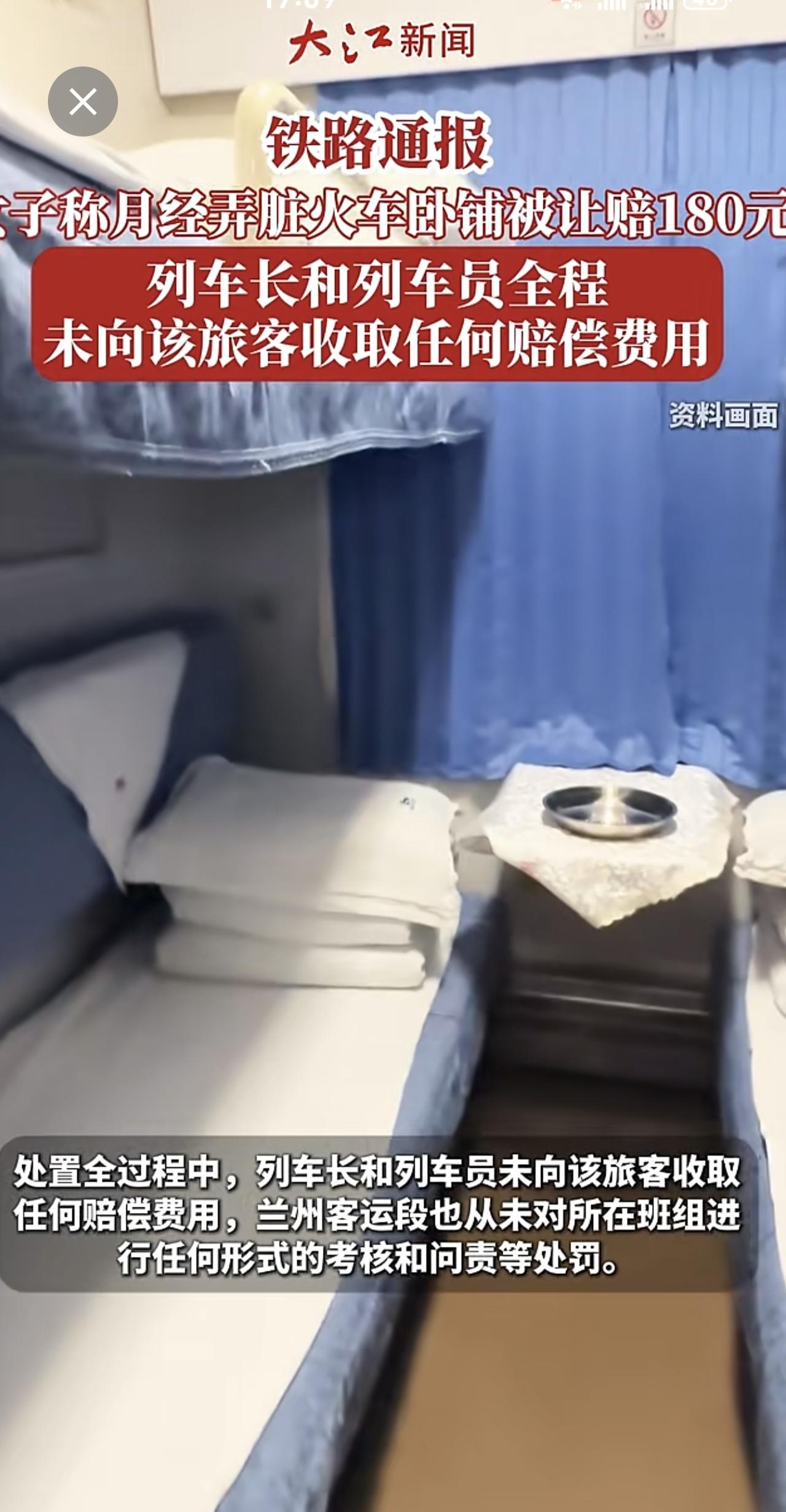 铁路通报“女子称月经弄脏火车卧铺被让赔180元”:列车长和列车员全程未向该旅客收取任何赔偿费用女子火车上突来月经弄脏卧铺床单