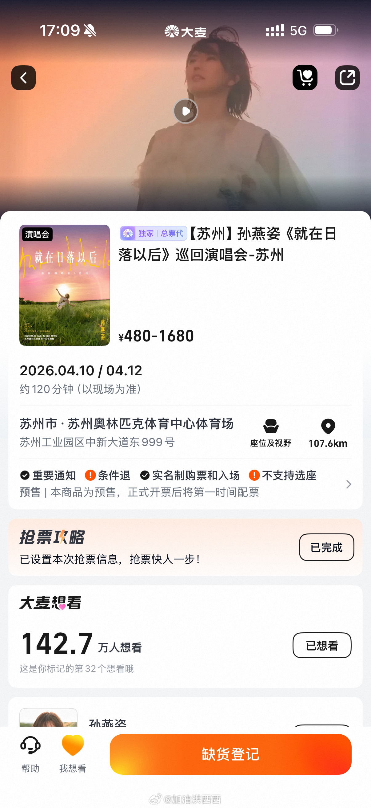 孙燕姿苏州这是和一百四十多万人竞争抢到的票💪这热度除了孙燕姿还有谁!苏州第一天!等俺!孙燕姿就在日落以后巡回演唱会