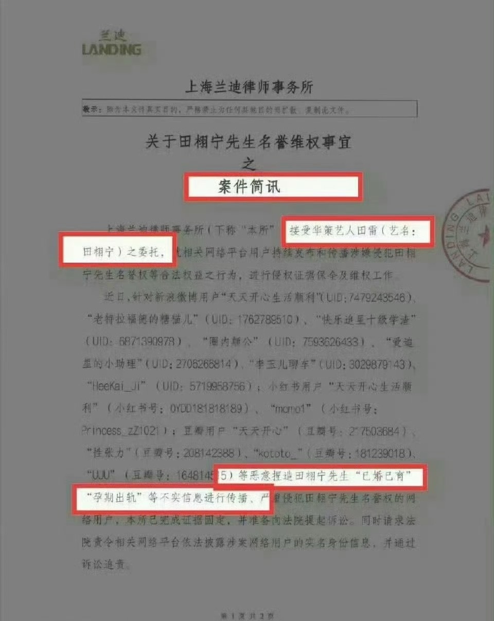 田栩宁曾三次强调自己单身,坚持未婚未育说法,还告了许多网友,部分被告还写了手写信