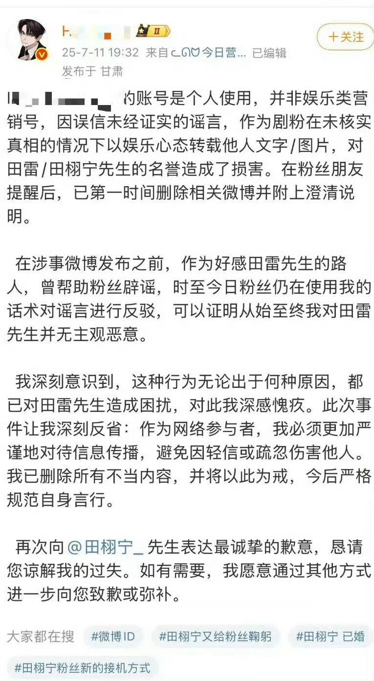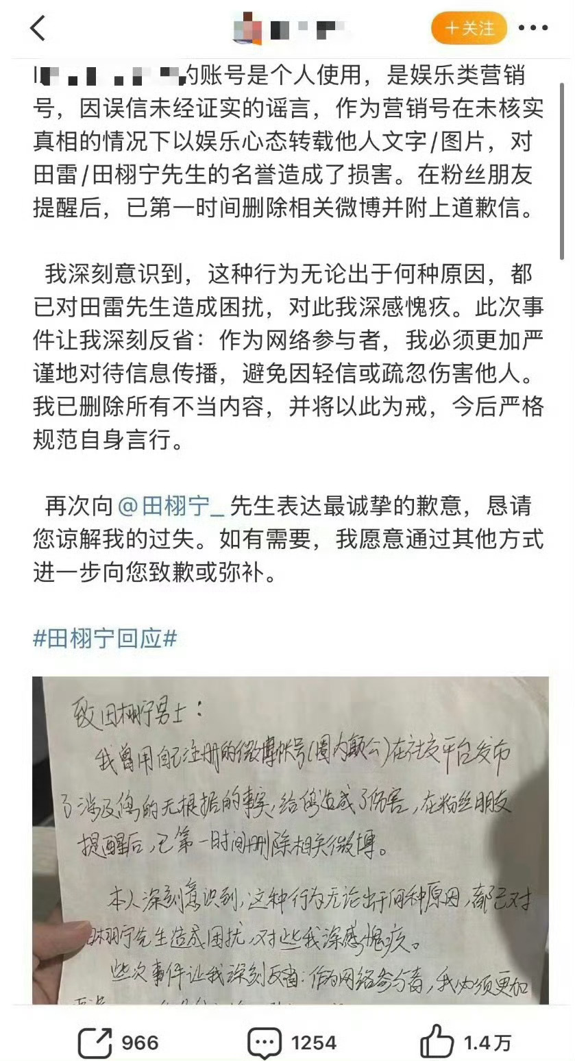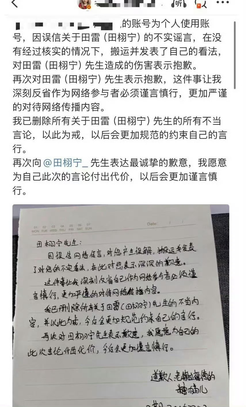 田栩宁曾三次强调自己单身,坚持未婚未育说法,还告了许多网友,部分被告还写了手写信向他道歉。