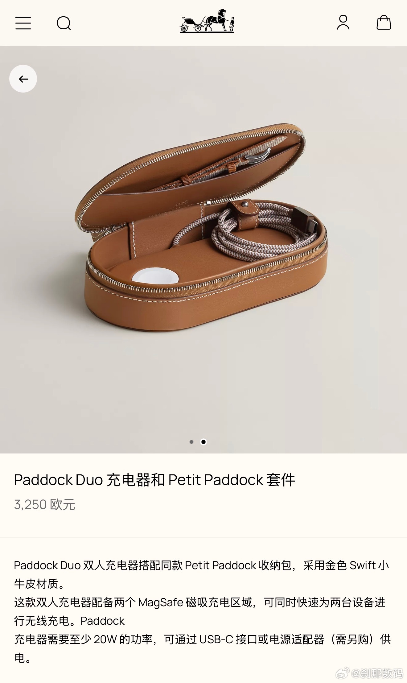 爱马仕法国官网推出独家Apple Magsafe配件,售价极其昂贵,20W无线充10800元人民币,配合收纳包+数据线套装25905元人民币。