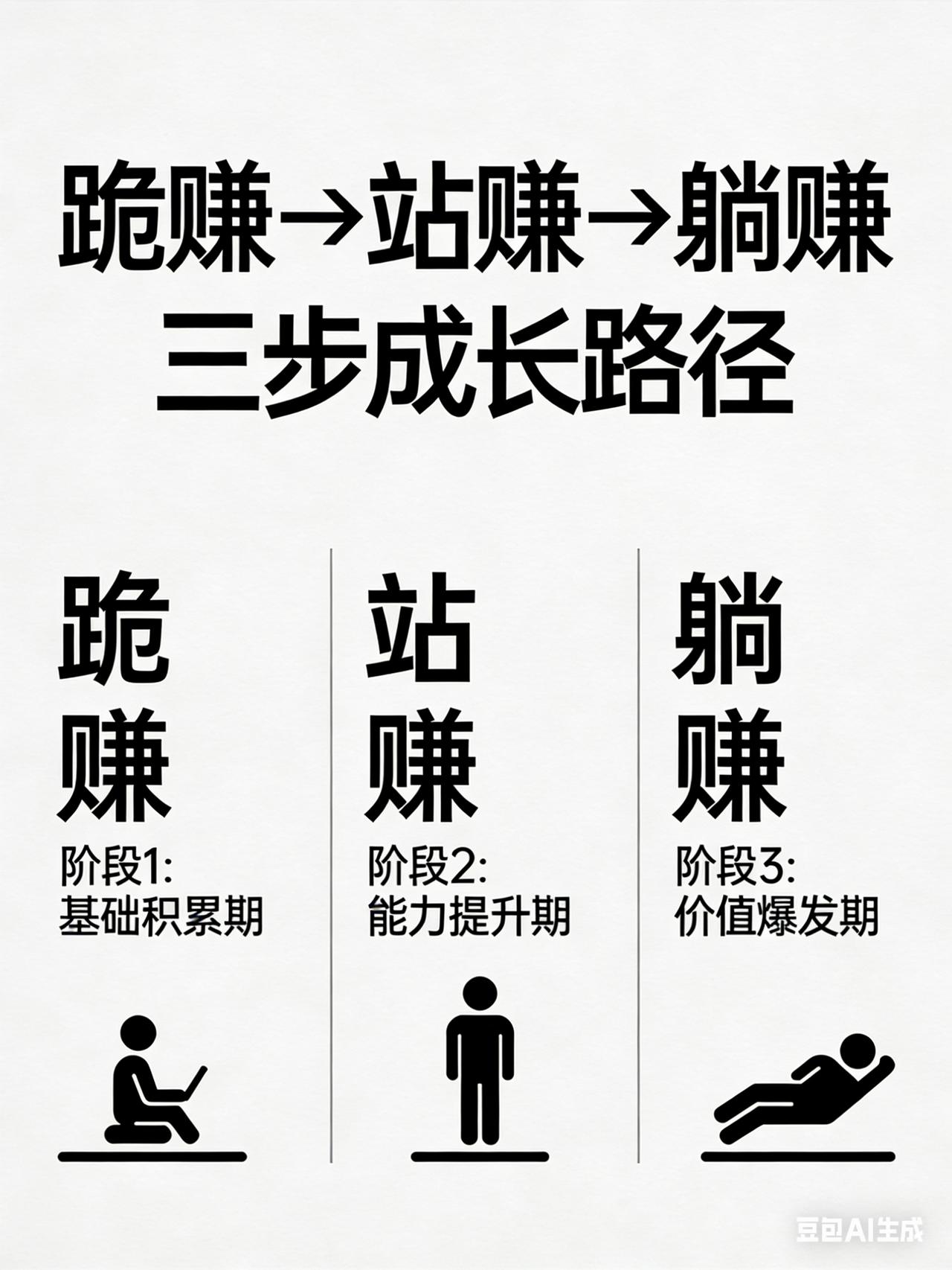 你有没有想过一个问题: 赚钱,到底是跪着赚,还是站着赚? 很多人一上来就说,尊严最重要。 也有人说,活下去才是硬道理,姿势不重要。 今天不灌鸡汤,只说真话。 一、先认清楚:钱,就是生存资料 人类从狩猎到农耕,再到现在的商业社会,目标一直没变: 拿到活下去的资源。 以前要拿命换食物, 现在不用拼命,只需要选一个姿态: 跪、站、躺。 这不是道德题,是生存题。 二、跪着赚钱:不丢人,但有两个底线 我自己跪过。 不是身体下跪,是精神上低头。 被无端指责、被PUA、被骂、被无端消耗。 我不恨那些人。 因为当时我没走,就是同意了这场交换: 用一部分尊严,换钱、换机会、换生存。 但跪着赚钱,有两个死线,碰一个就赶紧撤: 1. 跪了,还没赚到钱 2. 跪久了,忘了怎么站起来 第一种最亏,白受委屈。 第二种最可怕,人会废掉。 我见过太多人,对上谄媚,对下嚣张。 不是他们坏,是跪习惯了, 已经不知道直立行走是什么感觉。 这不是性格问题,是姿态成瘾。 三、站着赚钱:人类本来就该直立行走 我们的祖先从树上下来,第一件事就是站起来。 站着,才是人。 历史上一直推崇这种人: 不食嗟来之食,不为五斗米折腰。 我们管这个叫风骨。 站着赚钱不难, 难的是:站着,还能把钱赚了。 这不是清高,是能力。 当你有选择权,你自然就站得直。 四、躺着赚钱:不是懒,是高阶能力 大家都想躺赚, 说白了就是财务自由。 不是你有多少钱, 是钱能帮你赚钱,不用你亲自上场。 想做到这一步,需要三样东西: - 一笔基础本金 - 控制消费的能力 - 让钱生钱的专业方法 我们做咨询,核心就是一件事: 在可控风险里,多赚一分是一分。 最后一句实在话 先跪着活,不丢人。 但赚到能力的那一刻,一定要站起来。 别跪到忘记站的姿势。 更别一辈子只懂低头。 你现在是跪着赚,还是站着赚? 你愿意为了钱,低头到什么程度? 评论区告诉我。 短视频赚钱思维 新人赚钱思维 赚钱金句 爆款原理 爆文写作规则 短标题撰写技巧 流量标题