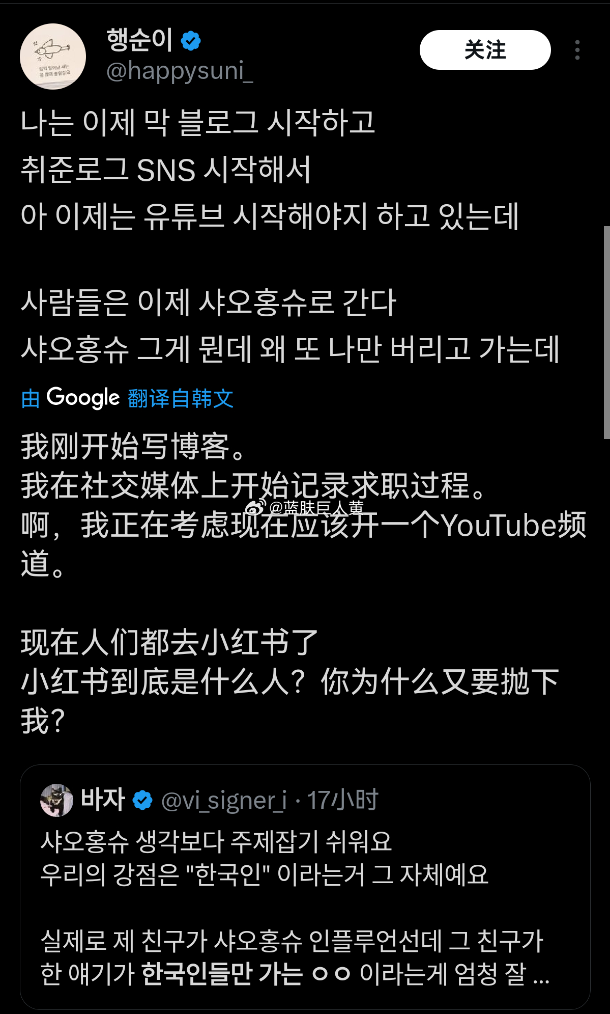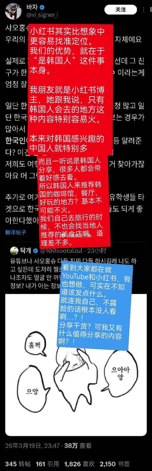 推特上韩国人讨论:只要在小红书上亮出韩国人的身份,就能够火,就能够赚中国人的钱