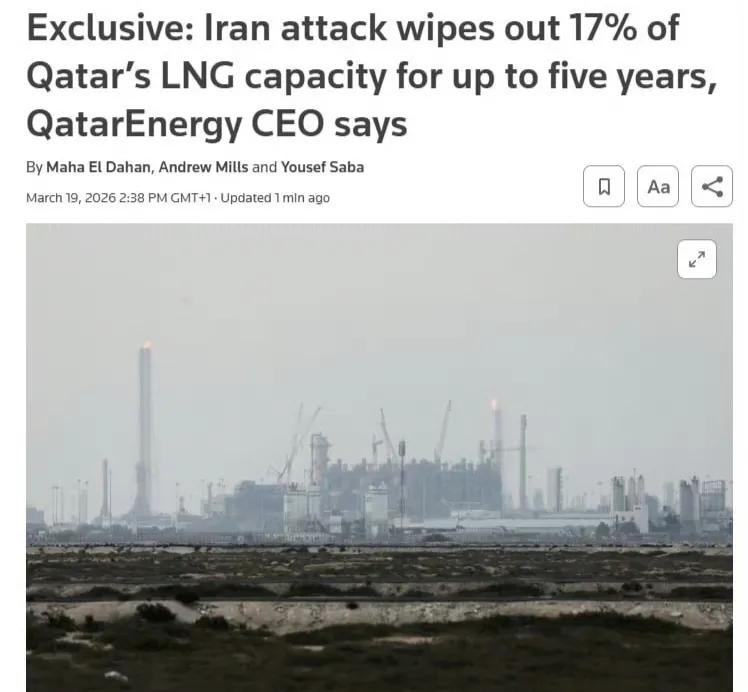 卡塔尔14条液化天然气生产线中的S4与S6生产线、一处天然气到液态燃料(GTL)设施因遭到伊朗打击受损,现在已经停止运行,预计维修时间为3至5年。 这也意味着卡塔尔大约17%的液化天然气产能中断,未来可能不得不对液化天然气合同宣布不可抗力,影响范围包括意大利、比利时、韩国和中国。 由于美国能源巨头埃克森美孚持有S4生产线34%和S6生产线30%的股份,这也对埃克森美孚造成了很大影响。