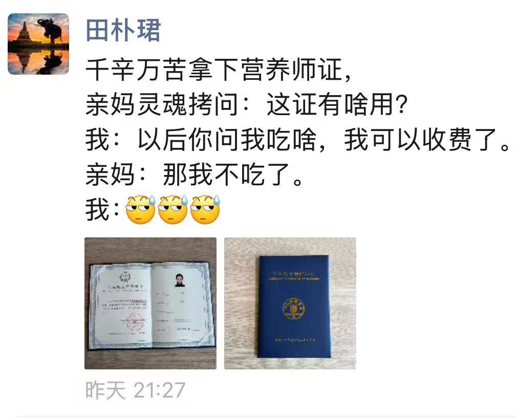 #田朴珺# 田朴珺朋友圈截图流出:田朴珺持证注册营养师。田朴珺的老公王石,也太幸福了吧!看田朴珺过去的社交动态分享,清晨的一杯养生饮,“小厨房”时光。现在终于明白了,田朴珺的健康知识、营养搭配分享,一直那么靠谱——原来这背后依托的是专业的营养师知识体系。这张证书,就是对王石和田朴珺,认真过小日子、小幸福的最好证据了。#王石#