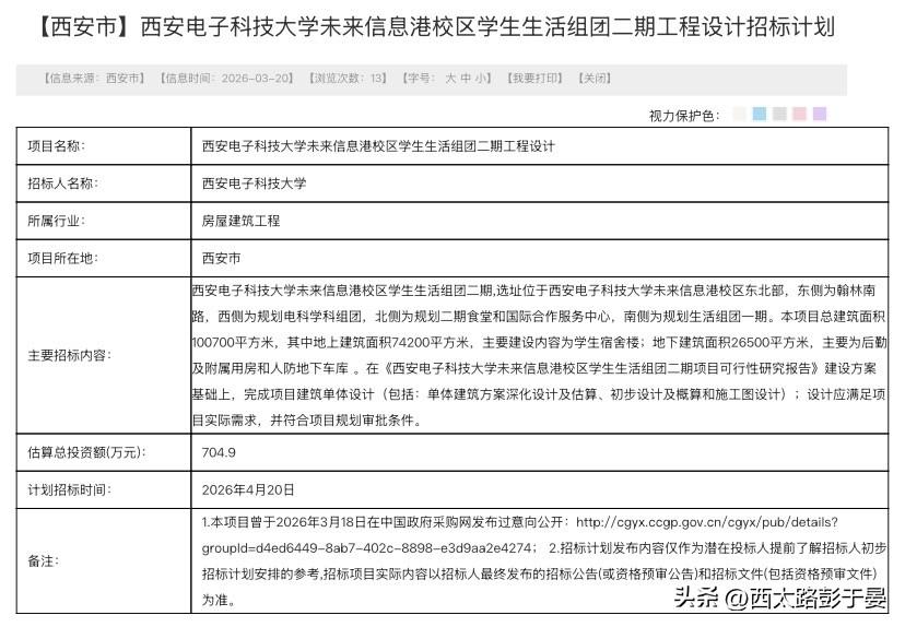 西电未来信息港校区提速!三大项目4月20日同步招标 西安电子科技大学未来信息港校区建设再提速!三大重点工程设计项目计划2026年4月20日同步启动招标,新校区建设进入实质性推进阶段。 本次招标涵盖前沿交叉学科组团、学生生活组团一期、学生生活组团二期,总建筑面积超26万平方米,统筹教学科研与生活保障两大核心功能。前沿交叉学科组团总建面6.2万平方米,作为校区首期科研教学核心,将打造学科交叉融合新载体;一南一北布局的生活组团,总建面近20万平方米,建成后可全面满足学生住宿、餐饮与日常服务需求。 三大项目均要求完成方案深化、初步设计、施工图设计及投资概算全链条工作,同步招标、协同推进,彰显校方整体建设思路。校区地处西安高新区辐射范围,依托西安科教与产业优势,助力“校区—园区—城区”深度融合。 作为电子信息领域双一流高校,西电新校区不仅拓展办学空间,更将为区域输送人才与科创动能,加速打造西部电子信息创新极核。目前项目已进入招标准备阶段,一座现代化、高品质新校区正加速从蓝图变为现实。