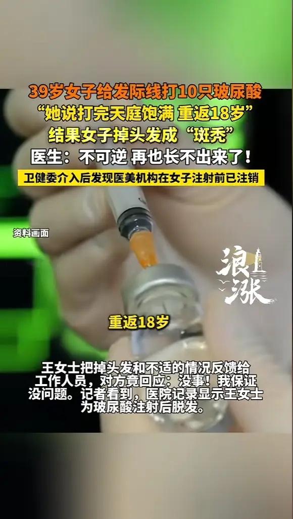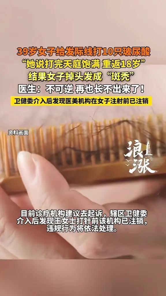 “这下后悔了!”近日,河南开封,一女子为了重返18岁,听信美容机构的建议,给发际线打了10只玻尿酸,结果打完之后,女子狂掉头发,最后直接秃了,医生还表示这是不可逆的,女子头发再也长不出来了!网友:这谁能忍? 王女士今年39岁,看着镜子里越来越高的发际线,心里总不是滋味。她刷手机时,常看到“高颅顶”、“少女感额头”的推送,心里痒痒的。一家美容机构的工作人员告诉她,现在流行用玻尿酸填充发际线,打几针就能让额头变得饱满圆润,瞬间年轻十岁,效果比生发产品快多了。 “打完天庭饱满,重返18岁!”这句话像魔咒一样,击中了王女士。她没多想,躺上了美容床。十支玻尿酸,被一针一针推进了她头皮发际线周围的皮肤里。当时只觉得头皮发紧发胀,工作人员还笑着说:“正常反应,漂亮总要付出点代价嘛。” 没过几天,注射过的地方开始掉头发。起初是一小撮,后来是一片,头皮上露出刺眼的白斑。她赶紧去找那家机构,对方却回了一句:“没事!我保证没问题。”可头发还在掉,直到头顶秃了一大块,她才哭着跑进了大医院。 医生诊断后认为是玻尿酸注射后导致的脱发,很可能是永久性的,毛囊已经坏死了。更让她崩溃的是,给她打针的那家机构,早在操作前就已经注销了。这意味着,她可能连追责的对象都找不到。 这两年一些无良机构只管收钱,把风险说得微乎其微,他们不会告诉你,头皮血管和毛囊密布,一次性注射大量玻尿酸,会严重压迫毛囊的血液供应。血液断了,毛囊也就饿死了,头发自然再也长不出来。 爱美没有错,错的是急于求成和轻信有“捷径”。真正的年轻态,是健康的气色和自信的光芒,它来自于规律作息、平和心态,而不是靠外来填充物撑起的一个僵硬轮廓。把改变容貌的决定权,交给那些连资质都没有的“美容师”,无异于一场豪赌,赌注是自己的健康和容貌。 在选择任何医美项目前,请务必冷静,查清机构和医生的资质,充分了解所有潜在风险。记住,在你脸上动针的,不应该是一个只会推销话术的销售,而必须是一个持证上岗的专业医生。 美丽诚可贵,安全价更高。别让对青春的渴望,变成一场无法挽回的悲剧。 各位读者你们怎么看?欢迎在评论区讨论。