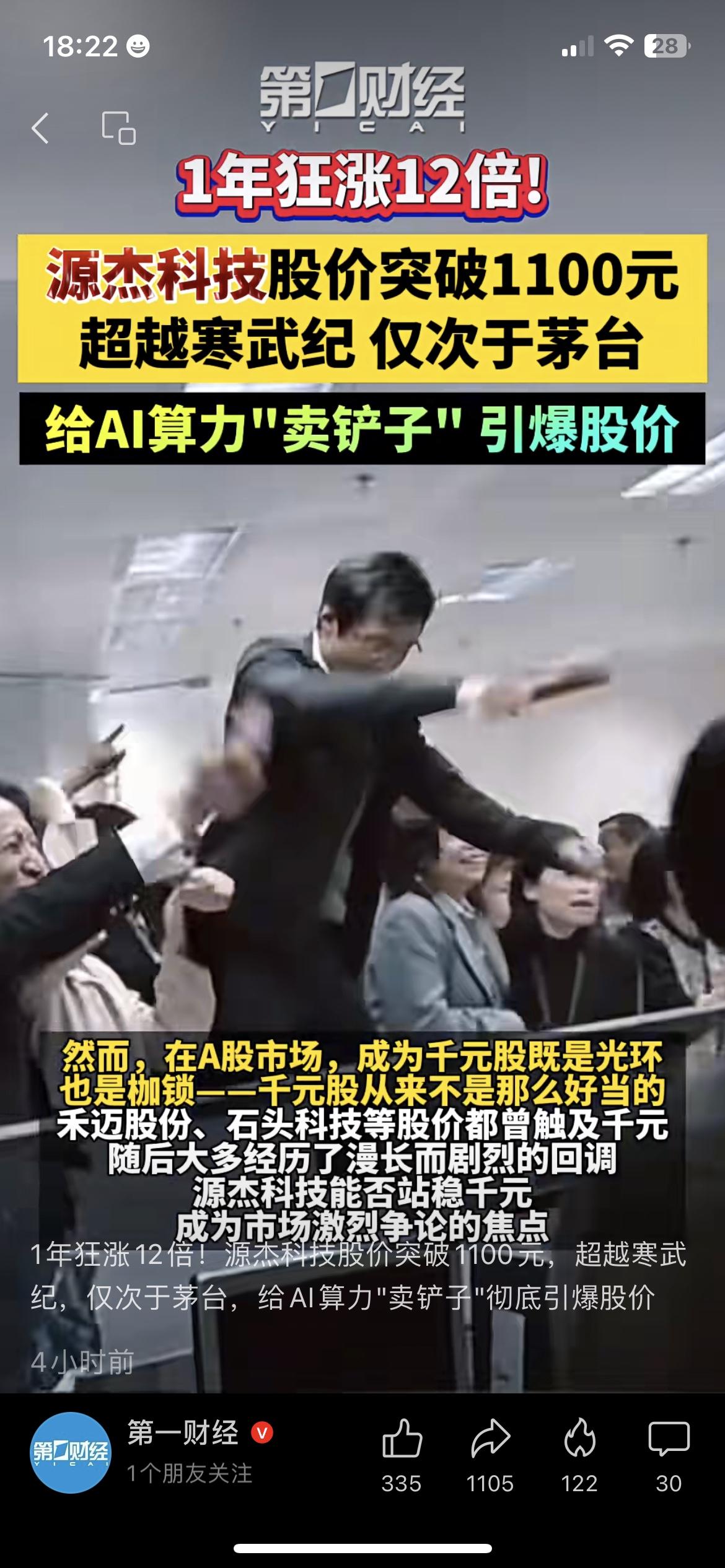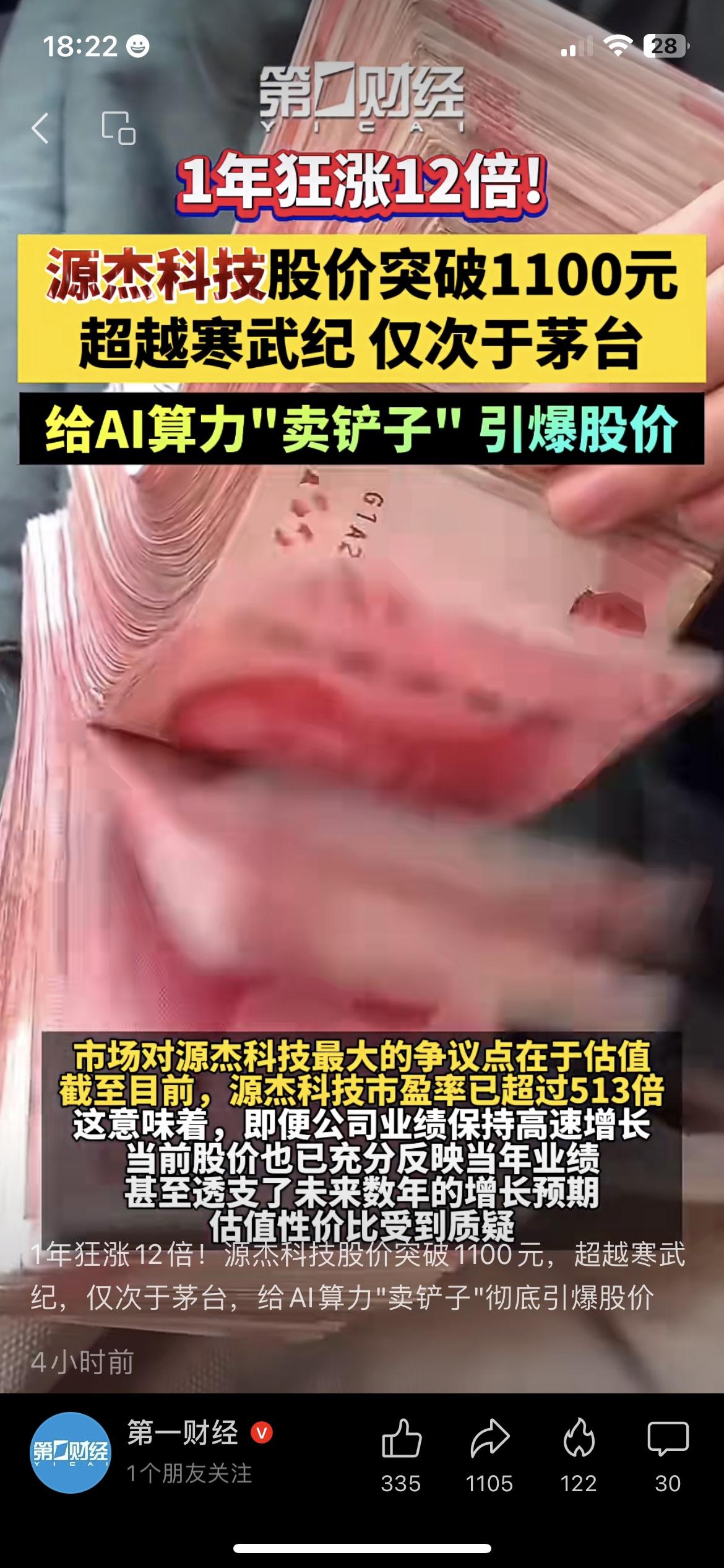 市盈率超513倍!千元股魔咒再现,源杰科技是下一个茅台还是石头科技? 1年狂涨12倍,股价冲破1100元,源杰科技直接干到A股第二高价股,仅次于茅台!给AI算力“卖铲子”的生意太炸了,可市盈率已经飙到513倍,相当于透支了未来好几年的增长。之前禾迈股份、石头科技也摸到过千元,后来全是漫长回调,这一次源杰科技能站稳吗?对咱们普通人来说,别光眼红股价,更要警惕高估值泡沫——市场有风险,投资需谨慎,不构成任何投资建议。 源杰科技 AI算力 千元股