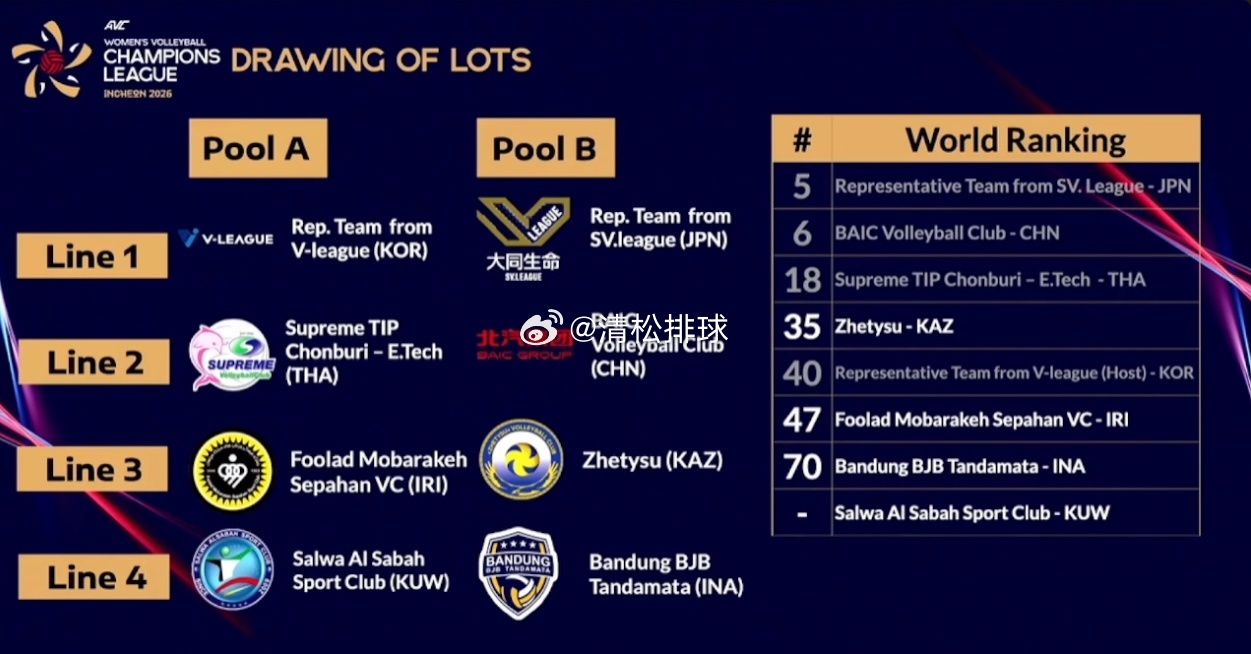 2026年亚洲女排冠军联赛抽签分组代表中国女排俱乐部出战的北京北汽女排分到B组清