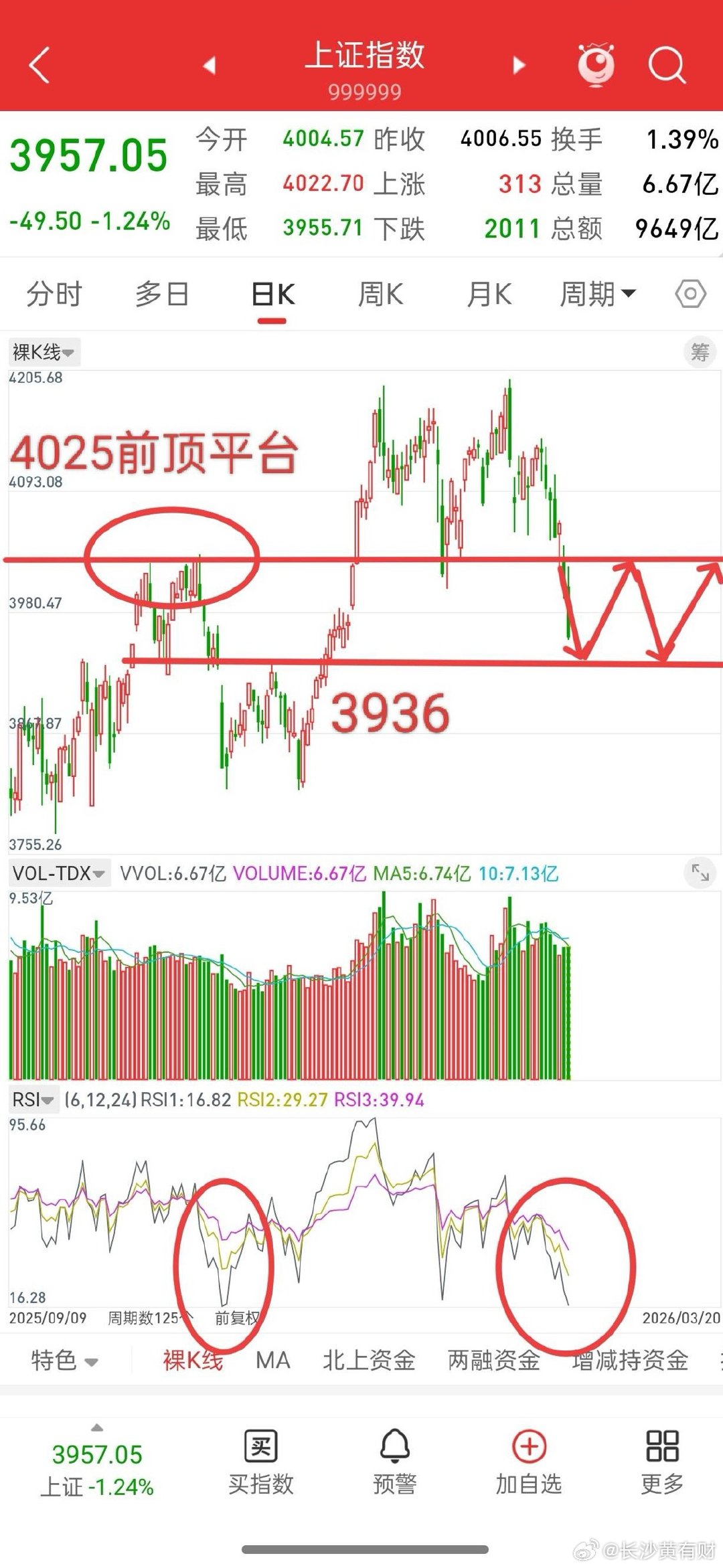 而当下,昨天跌破前顶平台4025,今天周五加速下跌,Rsi指标同样16,严重超卖,下周一我认为大概率会和11.24号一样,打出一个新低,这个低点就是左底。
