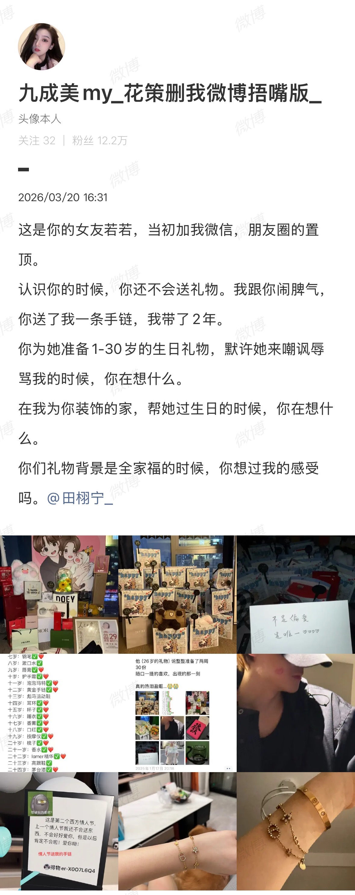 九成美持续发力,晒了若若朋友圈背景图是一家三口,还有田栩宁为若若准备的30岁生日礼物,而田栩宁送给九成美的项链九成美戴了两年。九成美发了田栩宁给若若的生日礼物若若朋友圈背景是一家三口 九成美晒若若朋友圈背景