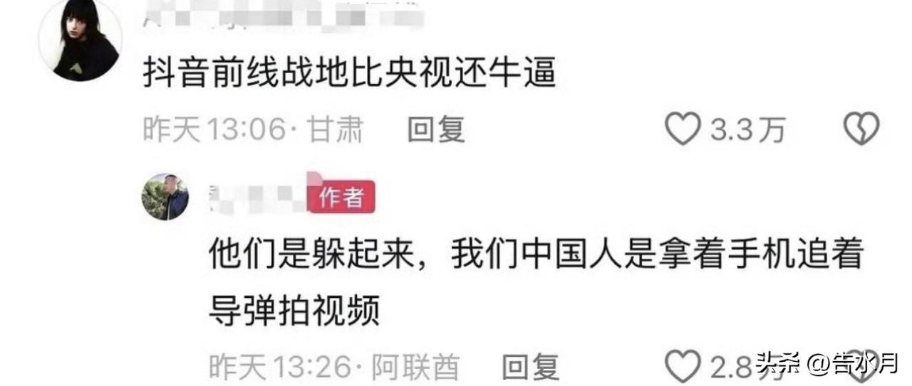 国人的凑热闹能力确实是全球都排得上号的,中东打仗,别人都躲在掩体里,在阿联酋的老铁表示咱们这是追着导弹拍视频… 只能说和平太久了,很多人失去了对危险的判断力了,导弹砸下来是真的会死人的… 还有一点就是对流量的追求,这个搞自媒体的应该能理解,一手消息那可真是流量爆炸啊!