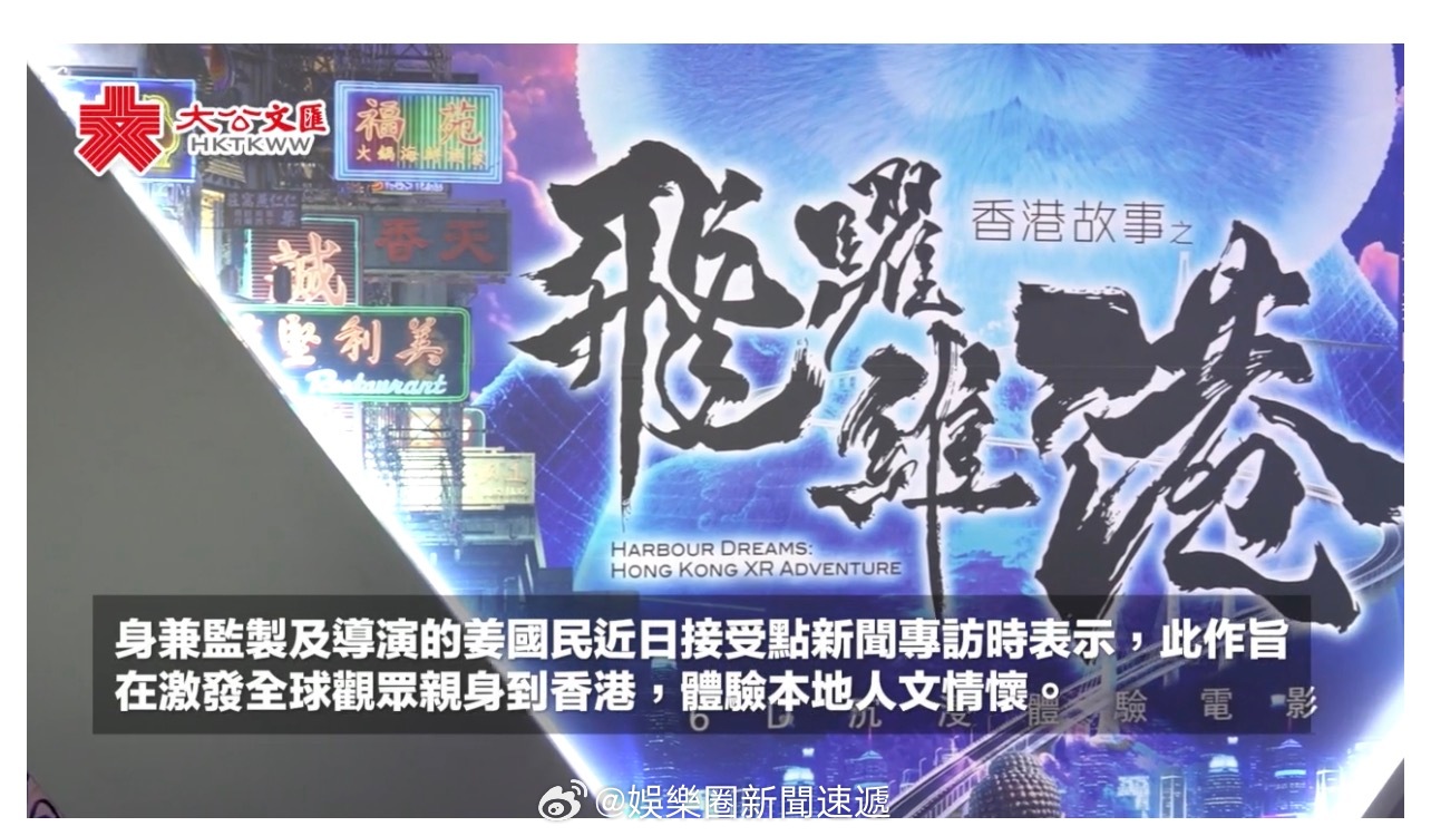 「(有視頻)全香港 首部XR電影以感官之旅玩轉香港 姜国民() :為業界開闢新出路 … 大公文匯全媒體報道,《香港故事之飛躍維港 》作為香港首部XR 多感官沉浸式電影,日前亮相香港国际影视展 ,這項全港首創的文旅體驗,透過20分鐘的沉浸式旅程,帶領觀眾全方位深度遊歷香港經典地標與文化精髓,打破傳統觀影體驗框架。身兼監製及導演的姜國民近日接受點新聞專訪表示,此作旨在激發全球觀眾親身到訪探索香港的熱情。