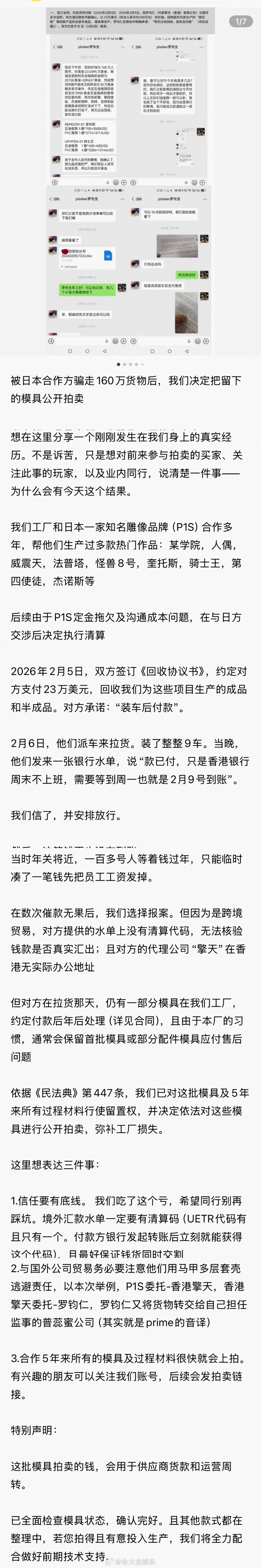 遭毁单工厂平台自救拍卖价超37万工厂把甲方欠款盘成二次元雕像福利了你可以永远相信二次元们的实力!一家日企(P1S)违约拖欠国内一家雕像工厂违约金160万,厂家无奈只能自救开始决定拍卖全套生产模具,直接从从五万多飙升到现在的三十多万,以后国产正版手办离我们也不远了,不敢想十成新骨折价的手办有多香~