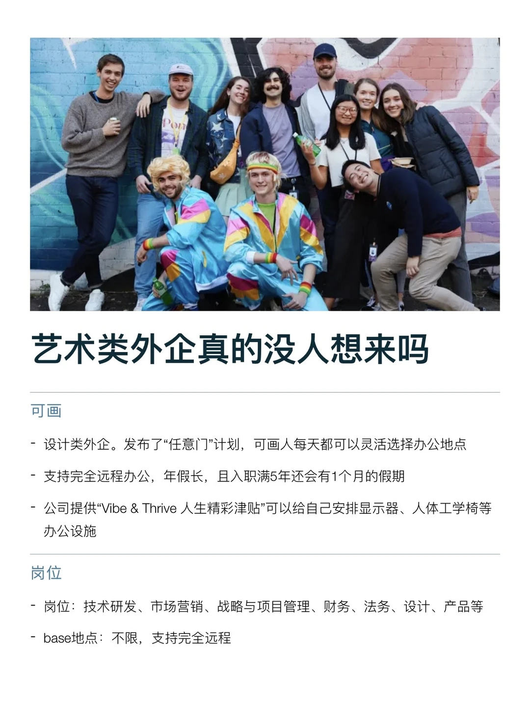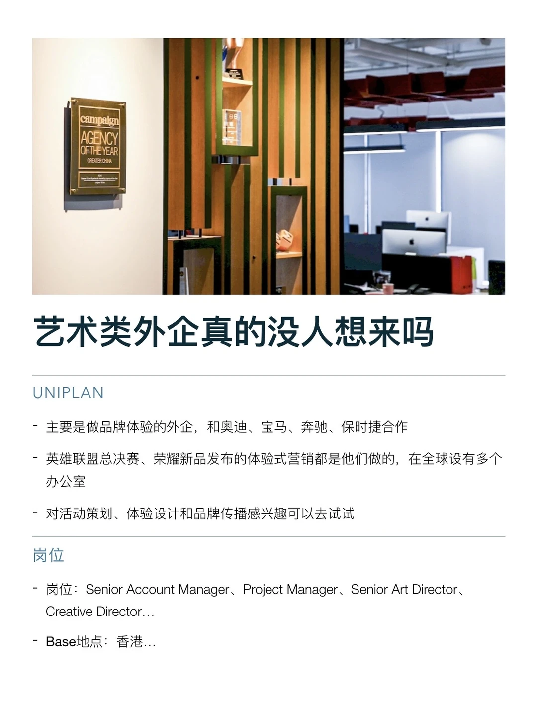 艺术类外企的工作环境,其实蛮适合对“审美”“视觉”感兴趣的人的。日常接触的是展览、视觉项目、品牌创意、艺术内容这些,会比其他行业更有趣 团队氛围也比较轻松,很多都是年轻人,沟通方式比较直接。节奏不算快,大多数是 955、双休,年假10–15天起,有些还支持远程或弹性办公 还有很多额外福利,比如活动资源、展览机会、品牌合作这些,都有机会接触到。如果本身就喜欢艺术、视觉或者创意方向,这类公司待着其实挺舒服的 坚持日更✊🏻,对外企感兴趣的欢迎常来看看