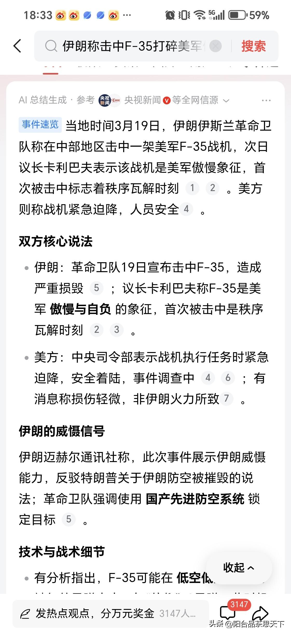 据官媒转载伊朗方面发布的消息,伊朗军队击落了一架美国f35战机! 那么这是真事吗? 正方:当然是真事,伊朗通过战术摸索使用先进雷达装备击落了f35,美国的回应就是证据! 反方:当然是假新闻,导弹击落飞机肯定会空中爆炸解体,伊朗军队应该拿出飞机残骸来验证,没有残骸说明就没有击落! 你怎么看? 美国对伊朗空袭 伊朗袭击f35 伊朗击中目标 伊朗击中 伊朗空战 伊朗击落以军机 美军击落无人机