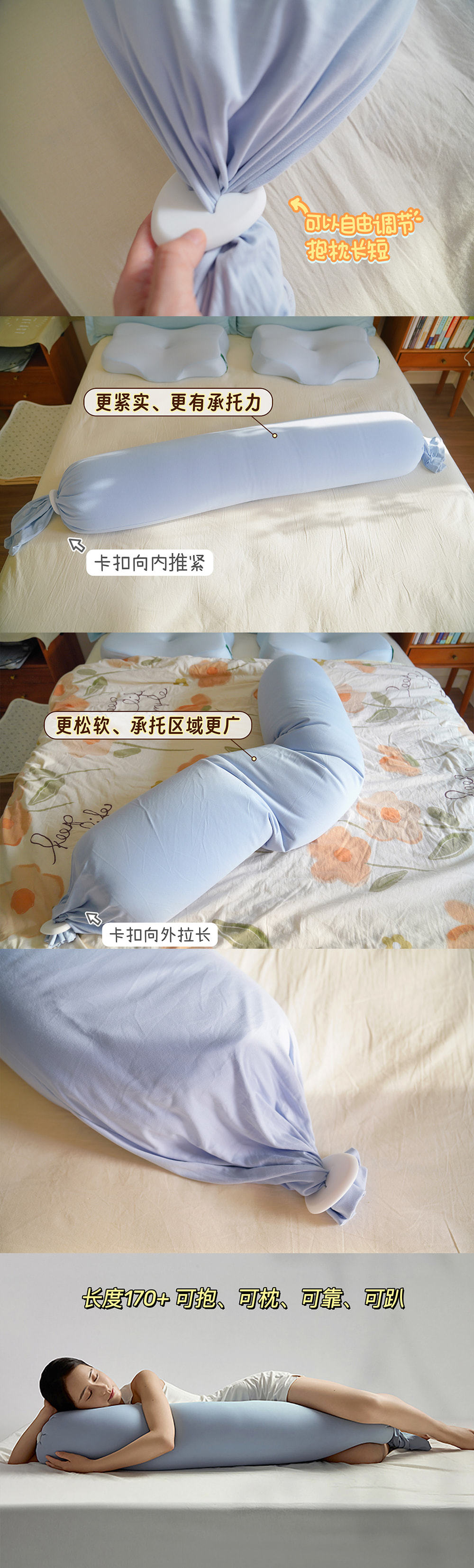 ✨ 为什么在众多抱枕中选择它?✅ 万能托举感:内部用的食品级EPS透气颗粒,不像普通棉花一压就塌,而是有一种空气感的蓬松+温柔的支撑力,不管是垫腿、垫腰,还是当靠枕,都能完美贴合身体曲线、让肌肉彻底放松~✅云朵般软糯手感:摸起来像在rua棉花糖,柔软又有弹性,非常好塑形,能完美贴合身体曲线,好像被云朵包裹一样,解压又治愈~✅ 百搭不挑人:它的长度和软硬度都可以调节,两端有卡扣,向内推,可以变紧实、更有承托力;向外拉,可以更松软、承托区域更广,可以同时给肩颈、手臂、腰椎、腿部释放压力,满足各种身形和需求~ ✅ 安心省事:A类面料,亲肤柔软无异味,拆洗很方便。还自带收纳袋,便于携带,不占空间~