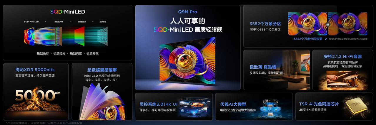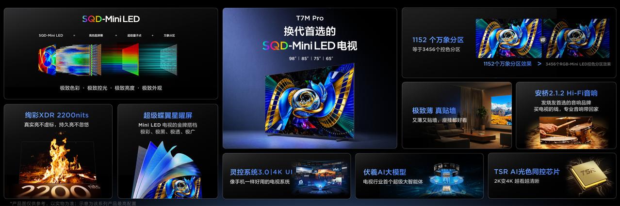 科技迷直说!现在电视技术下放太香了,普通人也能闭眼冲高端! 作为一个数码爱好者,真的明显感觉到显示行业的压力所在,技术卷,内容卷,价格也很卷,现在顶级显示技术,彻底下放了,对要换新电视的家庭来说真是好事一桩! 选电视最怕虚标参数,没啥实际用处。咱们普通人追剧、看电影,还是液晶电视最实在。屏幕够大、看着舒服,不管色彩还是清晰度,都比投影、平板强太多,全家一起看氛围感拉满。 尤其是 Mini LED 技术,TCL是全球第一梯队,更是电视圈里唯一自己有屏厂的品牌,从屏幕生产、核心技术到整机制造,全链条自己说了算。 在 Mini LED、量子点这些关键技术上,早就积累了深厚的功底,又有得天独厚的供应链优势,把高端画质直接拉到平民价。简单说:不用花大价钱,就能在家享受到影院级的观看体验,这才是真正的科技普惠! 不少人选电视陷入误区,误以为色彩越鲜艳画质就越出色。 其实高色域不等于高画质,真实沉浸感来自对比度、色域、亮度三者协同,明暗层次、细节质感与鲜活色彩缺一不可。TCL 凭借 SQD-Mini LED 技术,把这套 “画质铁三角” 做到普惠,让好画质走进更多家庭。 先说说,Q9M Pro 定位全民级 SQD 轻旗舰,是万元内高画质优选,覆盖 55/65/75/85/98 吋全尺寸,适配各种户型。它搭载全套 SQD 核心架构,最高 3552 个万象分区,控光效果等效 10656 分区 RGB-Mini LED,搭配 100% BT.2020 全域高色域、绚彩 XDR 5000nits 持久高亮与超级蝶翼星曜屏,画面通透细腻,看剧更有真实感。屏幕原生是 4K 150Hz,但是支持最高300Hz 高刷,这种高配置,在观影、游戏、赛事都完全可以拿捏。 而T7M Ultra 则是主打客厅首台 SQD 标杆,65–98 吋可选,专为家庭一步到位设计。最高 2176 个万象分区,等效 6528 分区控光水准,色域覆盖高,3000nits 峰值亮度持久稳定,同价位里属于妥妥的高配低价。 T7M Pro 则以跨代新技术领跑在主流价位段,率先普及 SQD-Mini LED,对比同价位产品形成技术碾压,换机直接闭眼入。惊人的售价就是王牌,国补后才5000起。 凭借屏幕优势和供应链优势,TCL 以技术普惠打破高价壁垒,让顶级画质不再专属旗舰,今年问题简单了,选好画质,认准 SQD 电视就够了。当技术站上巅峰普惠才有力量什么品牌电视性价比高什么品牌电视性价比高电视装修家电大家买高端电视一般看什么?电视剧看电视