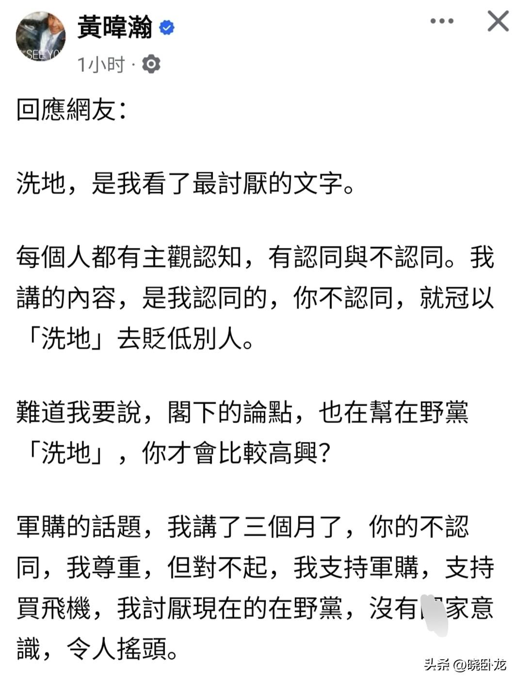 难以置信,黄暐瀚现在对国民党的“恨”如此之深。 黄暐瀚最近彻底不装了,接连发文表达对国民党的不满,不仅直接说“讨厌现在的在野党”(直指国民党,因为国民党就是岛内最大“在野党”),还用所谓的民调数据嘲讽蓝营“无痛失血”,其实这个时候用民调数据什么都说明不了,也毫无意义,可是黄暐瀚现在就是对蓝营有很大意见,说是“敌意”都不为过,他现在把私人恩怨公开化,为了自己能够痛快发泄情绪,如此夸大其词,带有明显个人偏见去攻击蓝营,真的不应该,足以说明他现在对国民党的“恨”太深了。 我一直留意黄暐瀚的动态,我发现最近他为了表达对国民党的不满,甚至把几年前国民党邀请他代表蓝营选不分区“立委”的事情都拿出来说,他说自己很庆幸当时拒绝了国民党。另外,有网友直指他为民进党“洗地”,黄暐瀚就发文说“洗地”是他最讨厌的文字。 种种迹象表明,曾经比较偏蓝立场的资深媒体人黄暐瀚,现在大变样,对蓝营的“恨意”到了不可思议的地步,我都感觉他的心态出现了问题。 我觉得一个人不管怎么样,因为利益也好,还是因为别的什么原因也罢,都不能对一个曾经给你那么多机会、帮助的阵营产生如此大恶意、恨意,你不知恩图报就算了,千万不要弄到这样的难堪地步,反目成仇不可取,忘恩负义要不得。 黄暐瀚,你自己该好好反思一下了,切勿“走火入魔”。