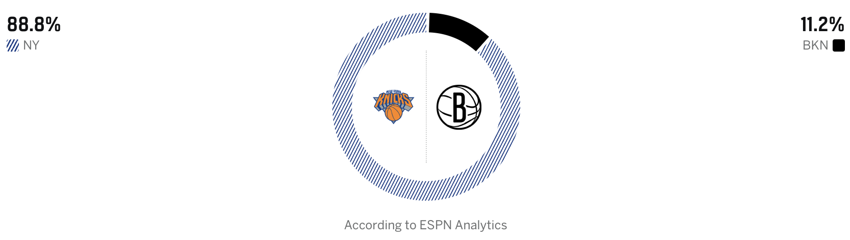 ESPN预测尼克斯vs篮网:尼克斯胜率88.8%,篮网胜率11.2%