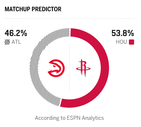 ESPN预测明日比赛:火箭胜率53.8%,老鹰胜率46.2%