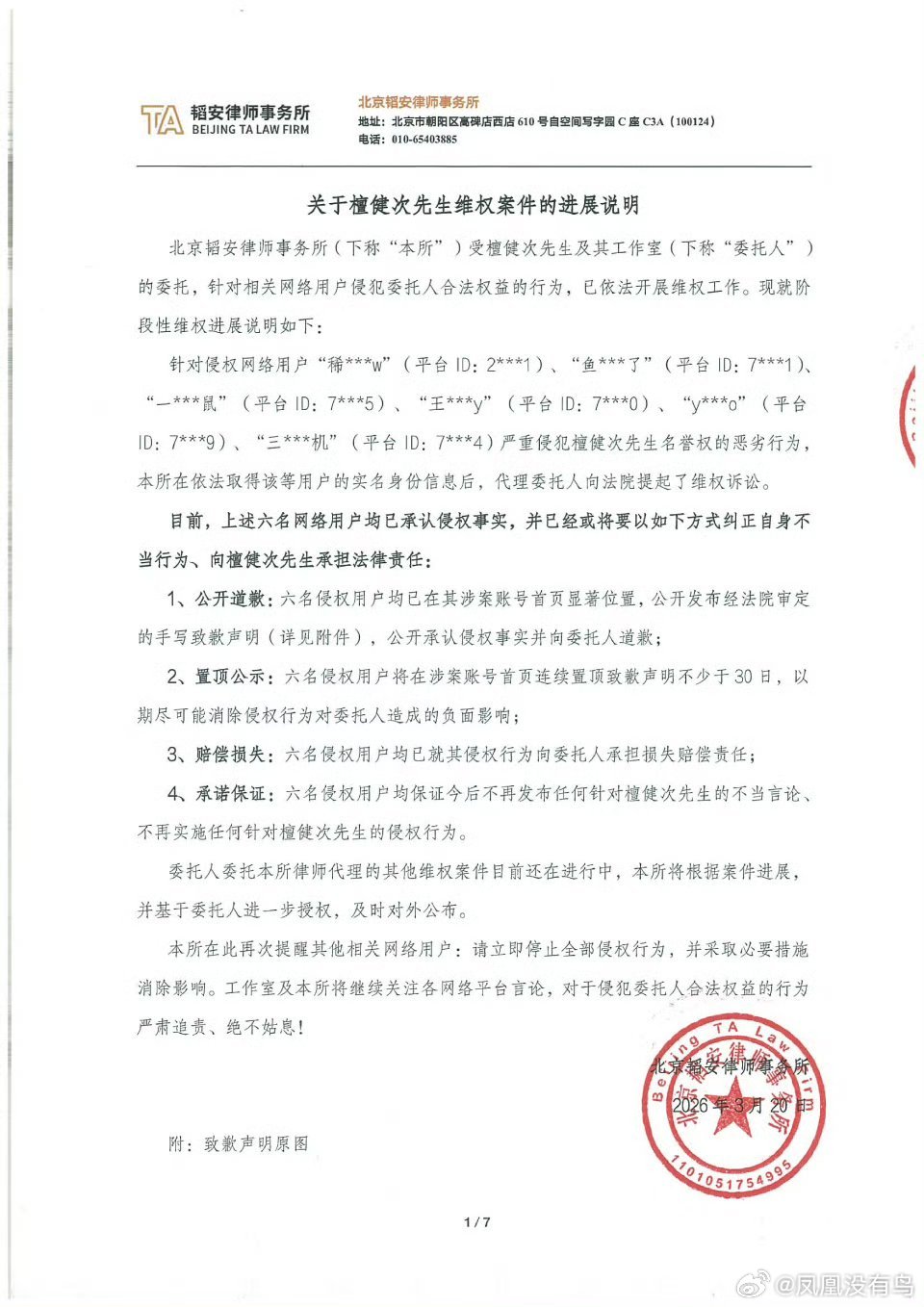 檀健次告黑声明,多位黑粉同时写道歉信向檀健次公开致歉。