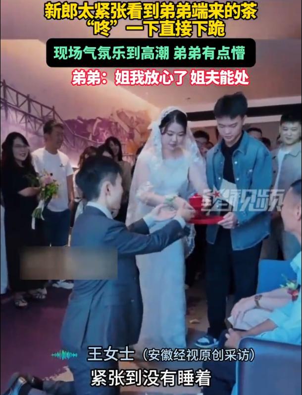 笑不活了!江西,一对新人结婚,没成想,新郎因为太过于紧张,看到小舅子端茶过来,新郎竟然直接给弟弟跪下了,一瞬间婚礼现场都笑翻了,就只有妻子尴尬,弟弟发懵。弟弟:姐我放心了,姐夫能处 当时的婚礼现场,本来好好的,到了给岳父岳母敬茶改口的环节,新郎站得笔直,看得出来是想表现好一点。结果小舅子端着茶盘刚走过来,新郎眼皮一抬,腿一软,“扑通”一声,直接给弟弟跪下了 全场瞬间炸了,笑倒一片。旁边的新娘子先是一愣,随后一巴掌拍在新郎肩膀上,又气又好笑,问他这是搞哪出。小舅子端着茶盘进退两难,愣在原地好几秒才缓过神 事后新娘王女士说,问丈夫为啥要给弟弟下跪,新郎自己都哭笑不得,前一天晚上紧张得一宿没睡,脑子里那根弦绷得太紧,到最后就剩一个指令:看到茶,就跪 问题是,茶是小舅子端过来的 这一跪,跪出了全网婚礼的名场面,也跪出了一个姐夫在娘家人面前的“最高礼节”。小舅子后来倒是想得开,半开玩笑地说:姐,我放心了,姐夫能处 这话听着像调侃,仔细想想还真是。一个人紧张成这样,说明他把这事看得重。婚礼上那些面面俱到的老手固然让人放心,但那种紧张到失控的笨拙,反倒让人踏实 谁结婚不是第一次呢。前一晚翻来覆去睡不着的,大有人在。第二天站到台上,脑子里全是提前背好的流程,生怕哪步错了让岳父岳母不满意,让媳妇丢面子。结果越怕错越出错,越是提醒自己别紧张,身体越不听使唤 新郎这乌龙,出在众目睽睽之下,丢人吗?确实有点。但大家笑的不是笑话他,是笑这个场面太真实了。谁没见过婚礼上紧张到同手同脚的新郎,谁没见过说话打颤、手抖拿不稳茶杯的新郎。这些“事故”后来都成了回忆里最有滋味的片段