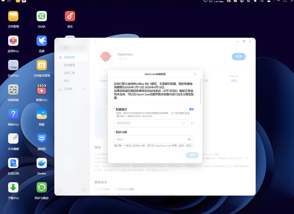 现在全网都是铺天盖地的“小龙虾”信息,之前看到大佬们熬了两个通宵才部署好,就没打算安装,前两天看到 绿 联 N A S 官号官宣内嵌智能大模型,可一键安装OpenClaw(和MiniMax合作,在3.13-4.12这一个月期间属于免费期,不用担心token的费用问题。),我也来赶赶这个热潮,毕竟安装 绿 联 N A S 应用中心版的话,部署在自己本地里,后续维护更省心。OpenClaw