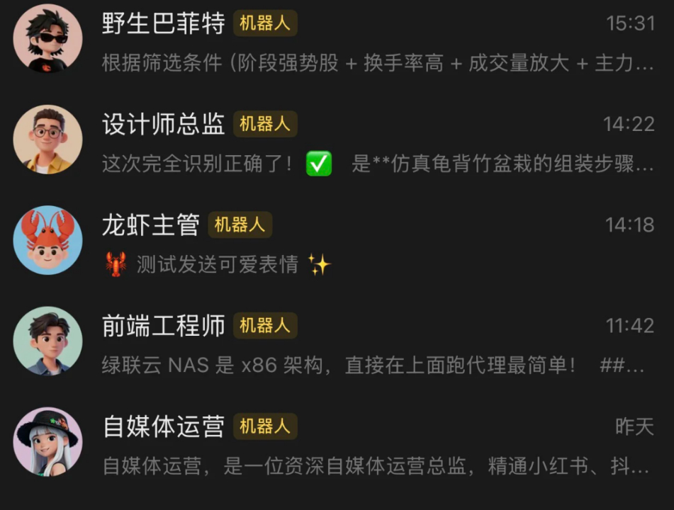 我现在把docker单独装在了SSD上,小龙虾只分配读取这个硬盘,机器人都可以正常链接,整体使用下来流畅度和效率都挺高的,很好使。给大家几个实际落地场景向:接飞书或企微当智能助手,定时汇总消息和待办;或者接浏览器做自动化,比如定时抓数据、监控页面变化;或者直接管本地文件,批量处理表格和自动归档。