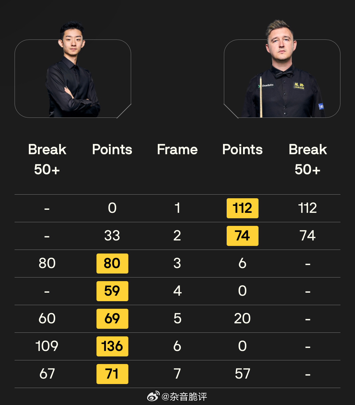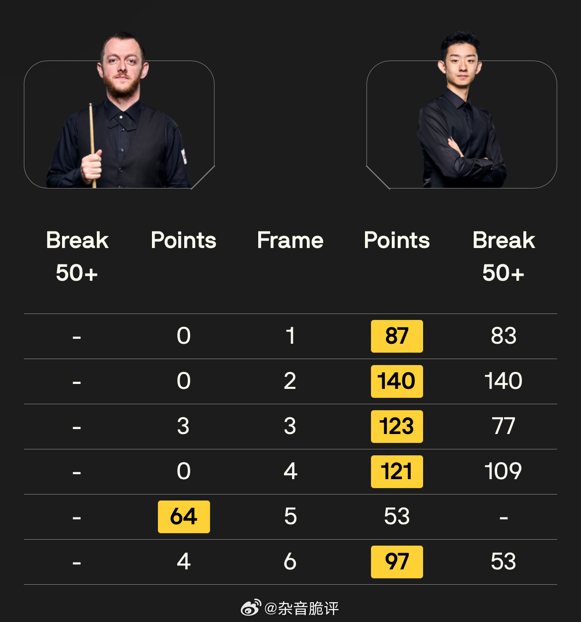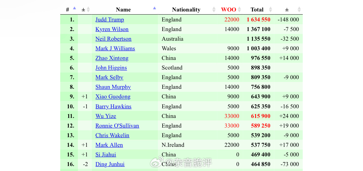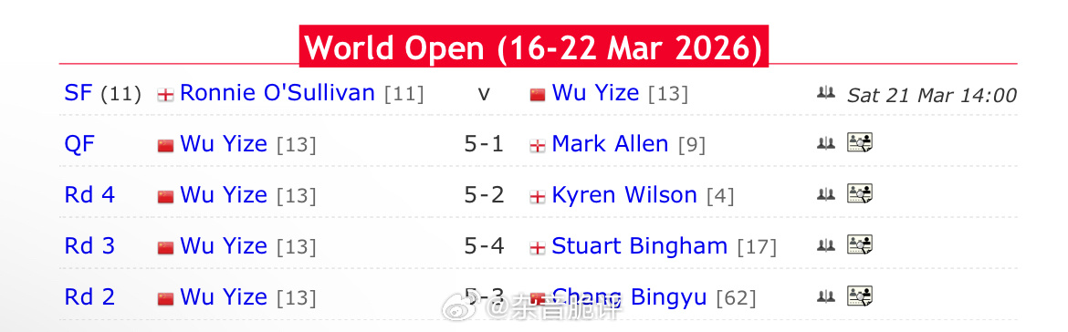2026斯诺克世界公开赛中国独苗吴宜泽不负众望5:1轻取马克艾伦进入半决赛,下轮将对阵奥神,双方目前状态皆非常出色,都有单杆制胜能力,相较而言吴宜泽则更为稳定。整个系列赛中其对手基本都是前16选手,皆战而胜之。相对于丁俊晖、赵心童,作为年轻世代的吴宜泽攻防两端都相对稳定,使得其排名已稳步上升至前10,且具备良好的上升空间,其未来可期