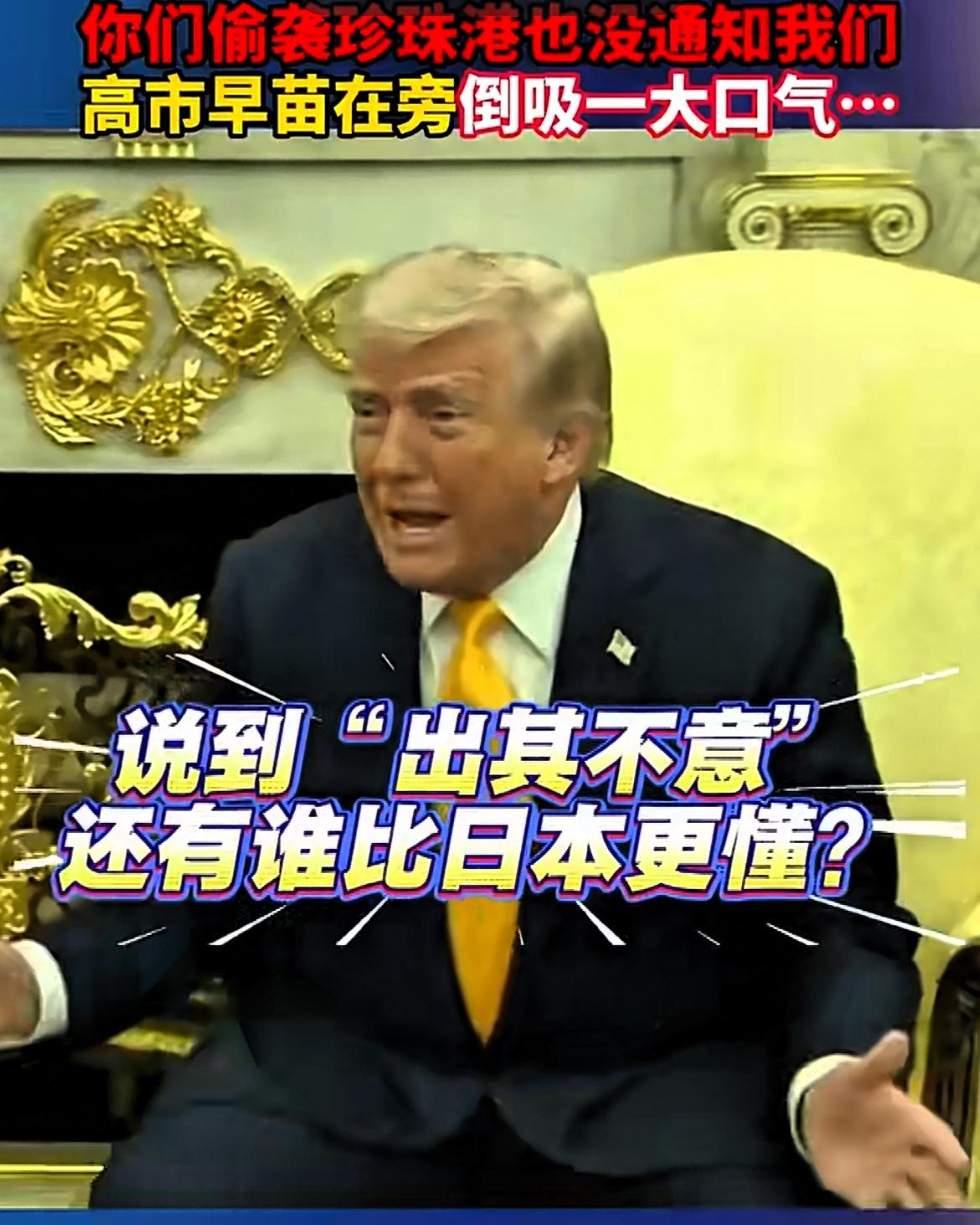 高市早苗算是把日本的尊严丢尽了! 3月19日,美国总统特朗普在白宫会见了来访的日本首相高市早苗。 一名记者询问特朗普,为何没有提前告知日本及其他盟友针对伊朗的战争计划。 特朗普回应道:“我们想打对方个措手不及。还有谁比日本更懂出其不意呢?你为何不跟我讲讲珍珠港的事?” 特朗普说完,现场一片哄笑。坐在一旁的高市早苗瞪大双眼,像个犯错的孩子般在椅子上显得十分拘谨,脸上还竭力维持着尴尬的笑容,愣是一句话都不敢接。或许她压根就没考虑过这个问题,所以被特朗普搞了偷袭,打了个措手不及。 这次特朗普偷袭高市早苗,不是也没有事先通知日本嘛。高市早苗这副模样,在国际场合上被如此调侃,她却毫无招架之力,只能默默接受这一切,实在是让日本所谓的“尊严”碎了一地。