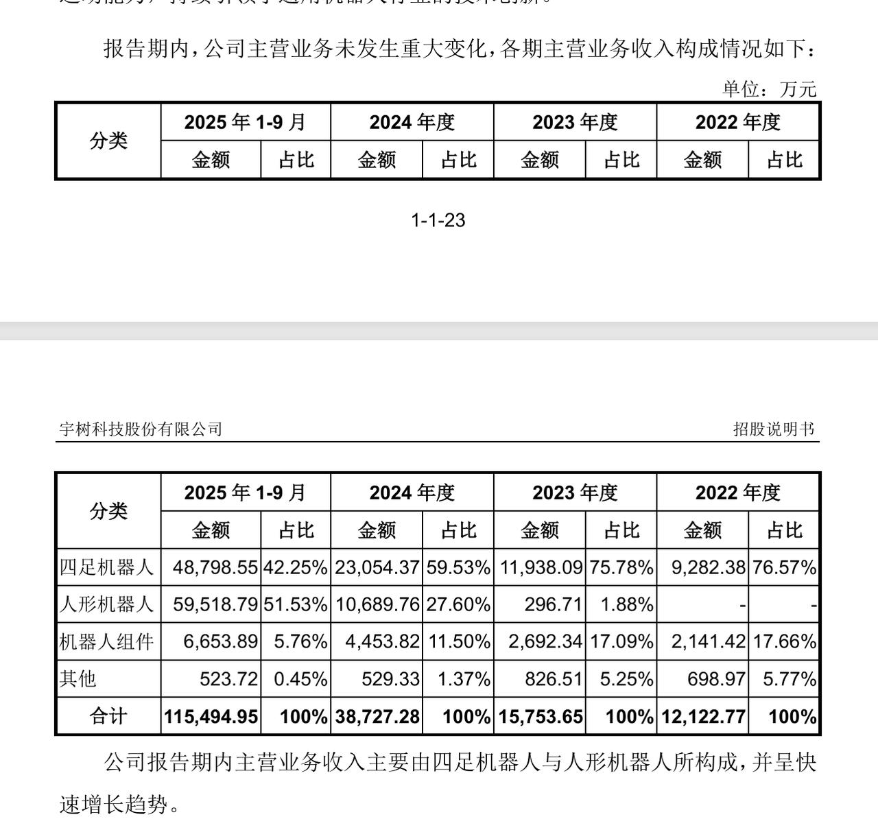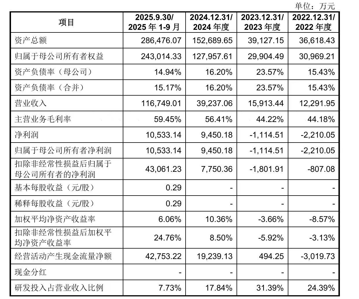 宇树科技IPO:2025年营收17亿,净利润6亿元 2025年度宇树科技营收17.08亿元,同比增长 335.36%;同期实现扣非后净利润6亿元,同比增长674.29%。 2022年至2024年及2025年前三季,公司营业收入分别为1.23亿元、1.59亿元、3.92亿元和11.67亿元,主营业务毛利率分别为44.18%、44.22%、56.41%、59.45%,净利润分别为-0.22亿元、-0.11亿元、0.95亿元和1.05亿元。