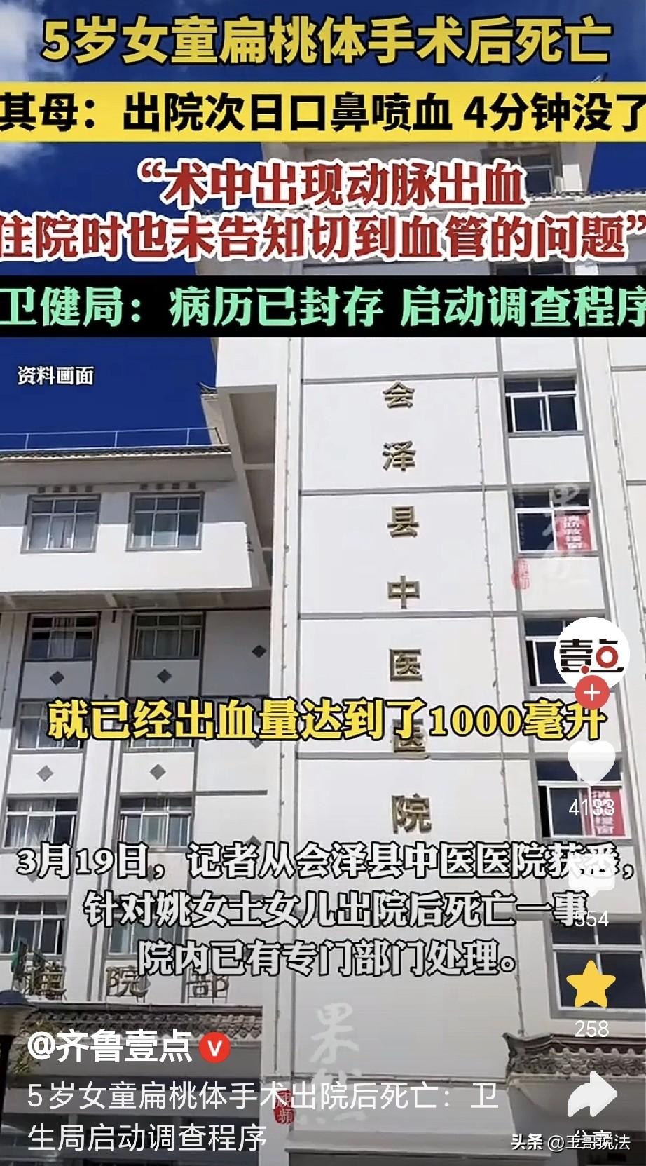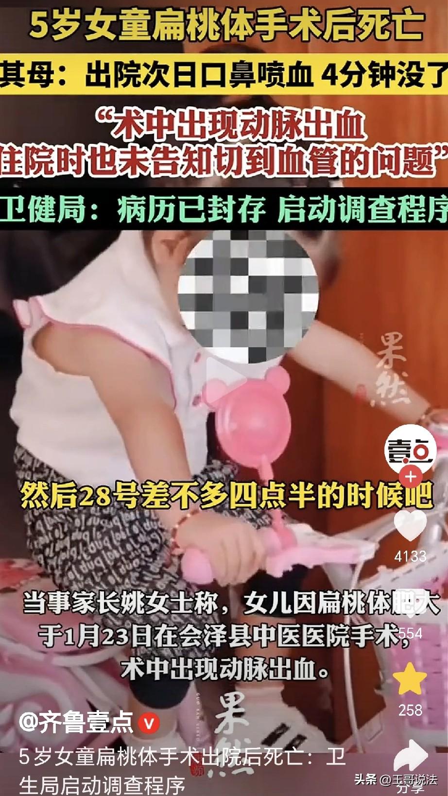 “悲剧还是发生了!”云南曲靖,一5岁女孩扁桃体肥大,医生安排了手术,术后住院观察了4天,可没想到,第五天女孩出院,出院后第二天,突然口鼻喷血,仅4分钟,女童死亡,父母悲痛欲绝,一看病历才知道,女儿手术时切到了血管,出血350ml,可医生就没提切到血管的事,父母无法接受,病历封存,目前已启动调查。 朵朵扁桃体肥大,父母带她来到中医院治疗,医生安排了手术,日期定在了1月23日。 手术之前,父母满心期待,想象着手术后女儿能健健康康,活蹦乱跳,再也不会因此困扰。 医生按照惯例,给他们讲解了手术风险和注意事项,父母选择了相信,医生在他们眼里,就是白衣天使。 可是,万万没有想到,手术原计划是1.5到2个小时,可朵朵的父母却等了近5个小时。 医生从手术室里走了出来,他们焦急的询问情况。 医生告诉他们,朵朵手术中出 血 量有点大,需要输血300毫升。 父母心疼,可事已至此,只要手术成功,以后可以给女儿慢慢补养身体。 接下来的4天,朵朵住院观察,医生再也没提过手术中的事情。 1月27日,医生告知,朵朵可以出院了,姚女士高兴极了,收拾东西,带着朵朵就回到了家里。 父母以为,从此后朵朵就能健康成长, 可是,谁也没有想到,1月28日下午4点半左右,朵朵毫无征兆,突然就口鼻喷血。 鲜血瞬间染红了一片衣服,父母手忙脚乱,他们想要止血,可是又不知道是哪里出了问题。 仅仅4分钟的时间,朵朵死亡! 朵朵的父母无法接受,他们想不明白,明明手术已经顺利完成,孩子也出院了,怎么突然就会这样。 他们开始查找病历,这才发现,手术中出血量根本不是300毫升,而是350ml。 他们仔细回忆,在朵朵住院的4天里,医生没有提到任何切到血管的事情。 而朵朵住院了第二天口鼻喷 血,瞬间出血 量达到了1000毫升。 更让他们难以接受的是,法医 解 剖 结果显示,朵朵体内有结 扎线,但却找不到对应的动脉血管。 孩子就这么没了,朵朵父母痛不欲生,他们认为,医院和医生有不可推卸的责任。 姚女士表示,将追究医院和医生责任,还要提起民事诉讼。 3月19日这天,记者获悉,中医院已经成立了专门部门处理此事。 当地卫健部门也启动了调查程序,封存病历。 如今,朵朵的父母每天都在痛苦和煎熬中度过,他们看着女儿的照片,泪水止不住地流。 他们多么希望,这一切只是一场梦,醒来后女儿还能像以前一样,甜甜地叫他们爸爸妈妈。 朵朵的去世,给父母带来了沉重的打击,他们陷入了无尽的悲伤,没了女儿,天都塌了。 有人表示,我家孩子5岁,也说腺 样 体大,睡觉打呼 噜,医院检查需要手术切除,我没同意,说9岁孩子腺 样体就会小,我就一直等着,现在8岁了,睡觉已经没问题了,孩子太小,问题不大,能不做手术尽量不要做手术。 也有人说,我的经验,但凡有医生建议做手术的病,只要不是急 症,一定要去三家以上的三甲医院看过再决定。 更有人说,小 手 术 大事 故,一定要追责严惩! 《民法典》第1218规定: 患者在诊疗活动中受到损害,医疗机构或者其医务人员有过错的,由医疗机构承担赔偿责任。 朵朵父母认为,医院和医生有不可推卸的责任。 理由是手术实际情况与医生告知不符,出血量有差异,医生未告知切到血管风险等。 而且法医的解 剖,也存在 异 常,发现了结 扎 线,却没找到对应的血管。 若经调查,能证明医院医生在手术操作、信息告知等方面存在过错,且该过错与朵朵的死亡存在因果关系,那么医院就应承担赔偿责任。 对此,你怎么看?