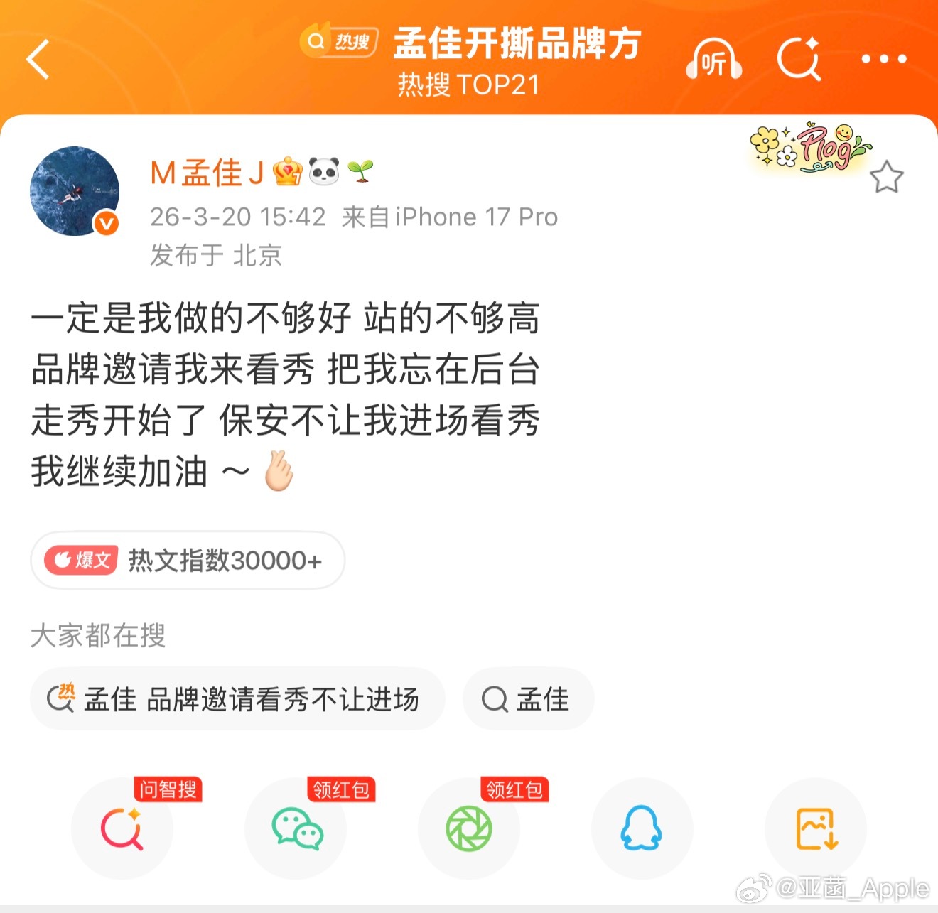 孟佳开撕品牌方什么情况?孟佳受邀看秀被保安拦在门外 评论区有网友说是如下品牌 到