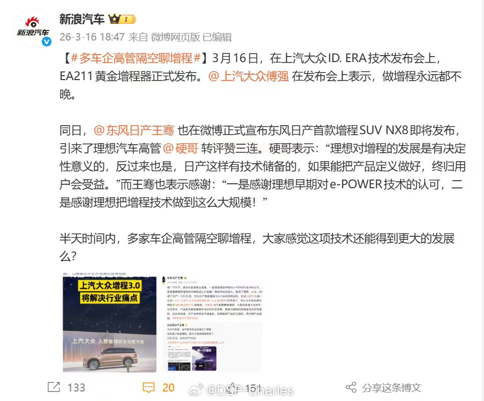 现在剧情反转了:东风日产反过来感谢理想,说谢谢你们把增程在中国市场做起来了,让更多人看到这条技术路线的价值。