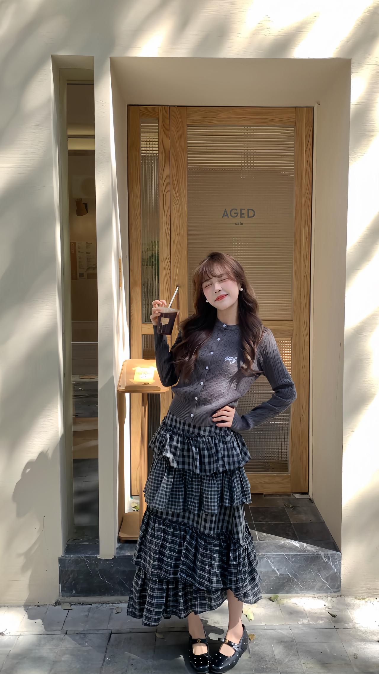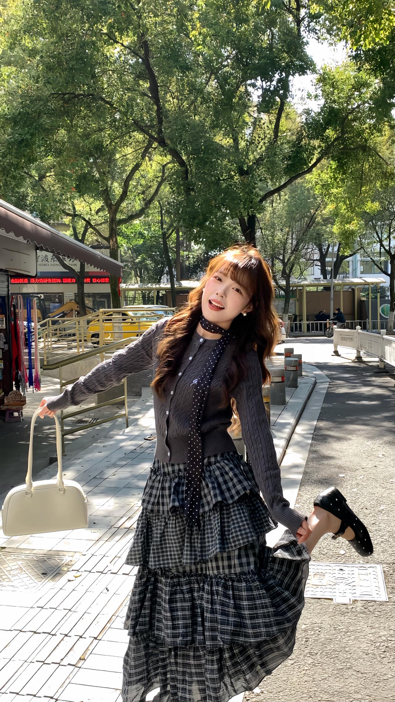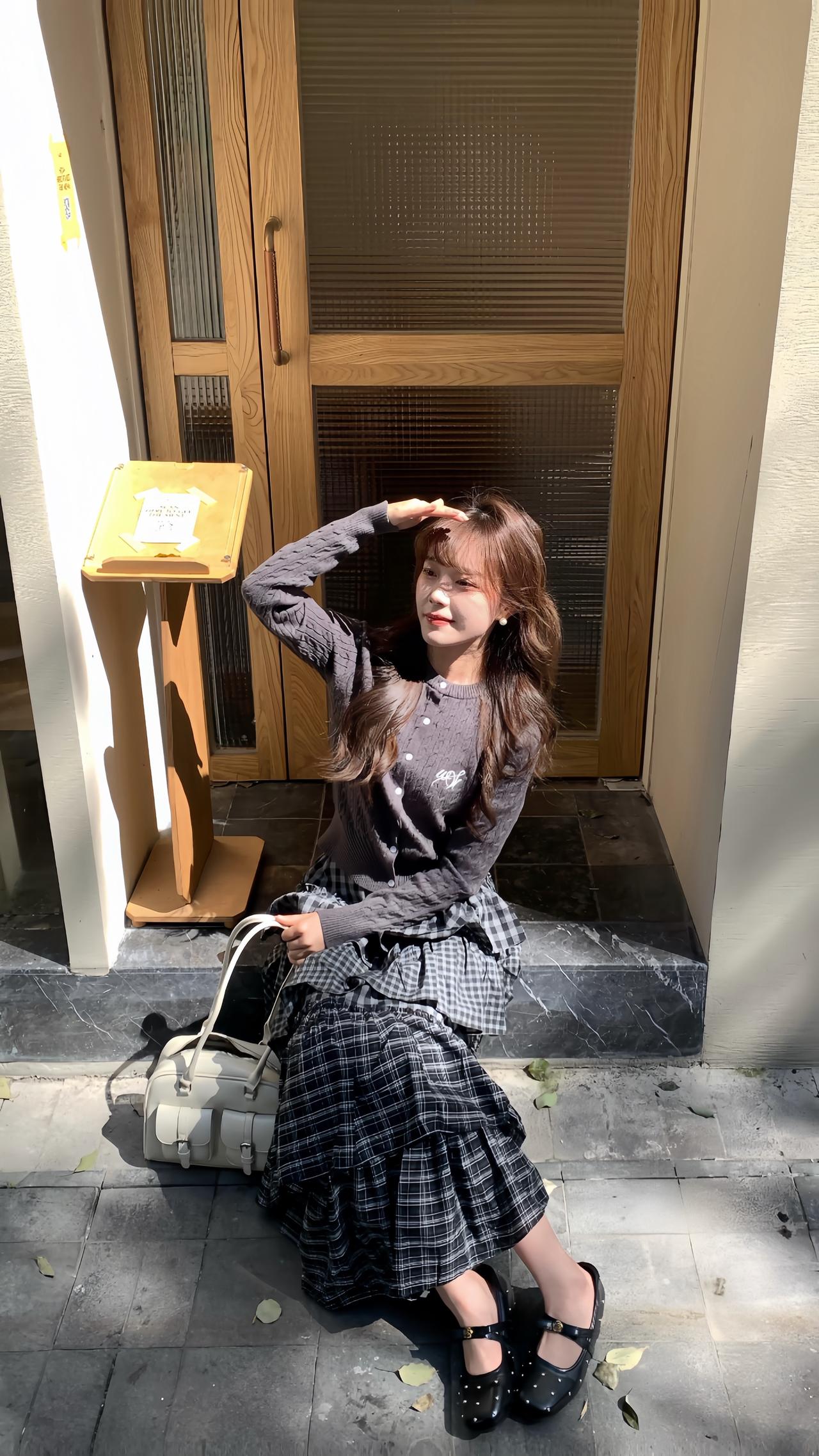 早春穿搭公式: 短款针织开衫 + 不规则格纹蛋糕裙 韩系又减龄 早春穿搭 韩系穿