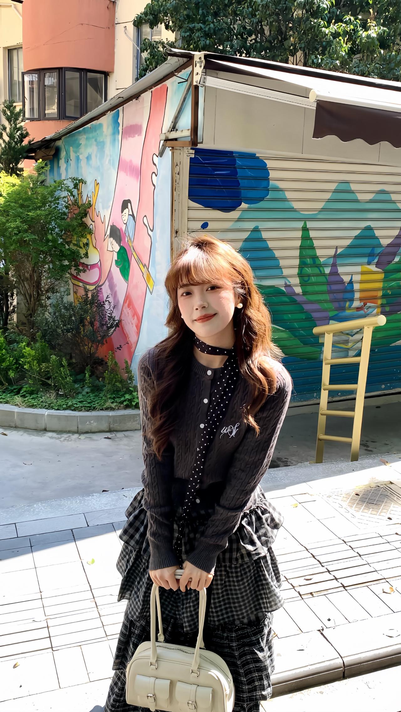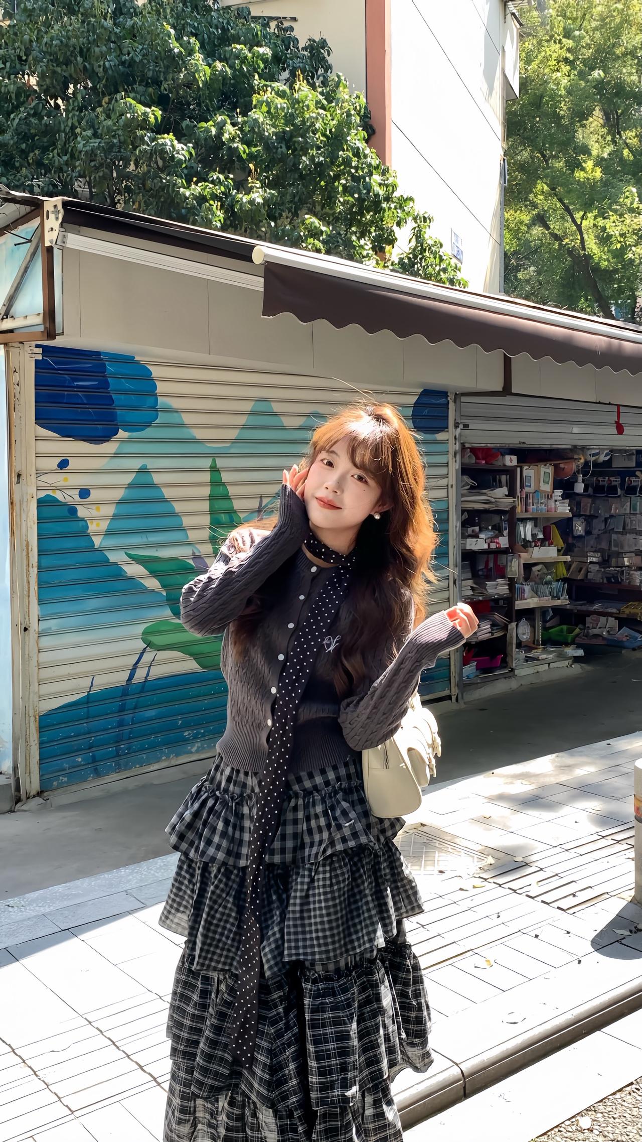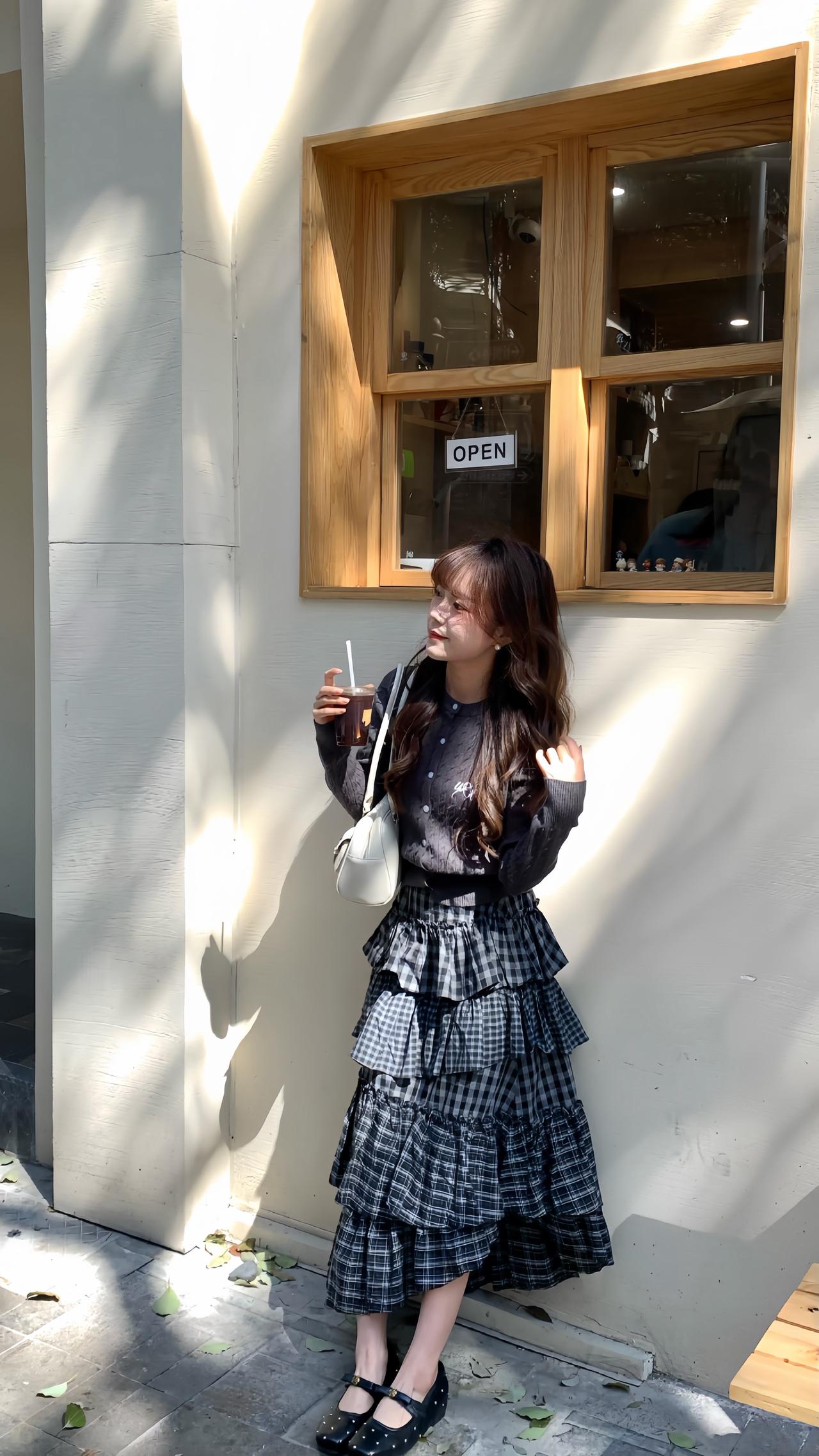 早春穿搭公式: 短款针织开衫 + 不规则格纹蛋糕裙 韩系又减龄 早春穿搭 韩系穿