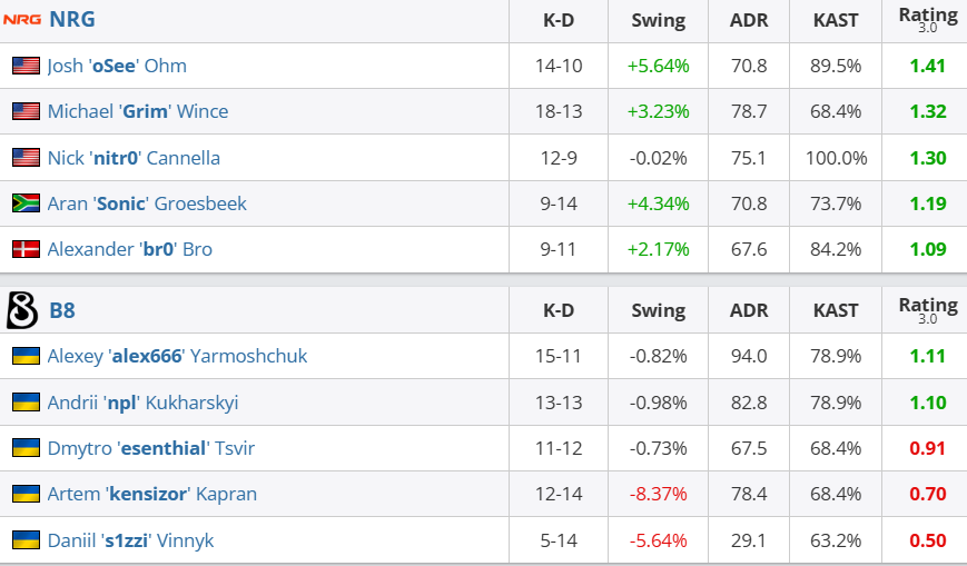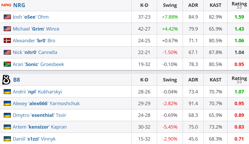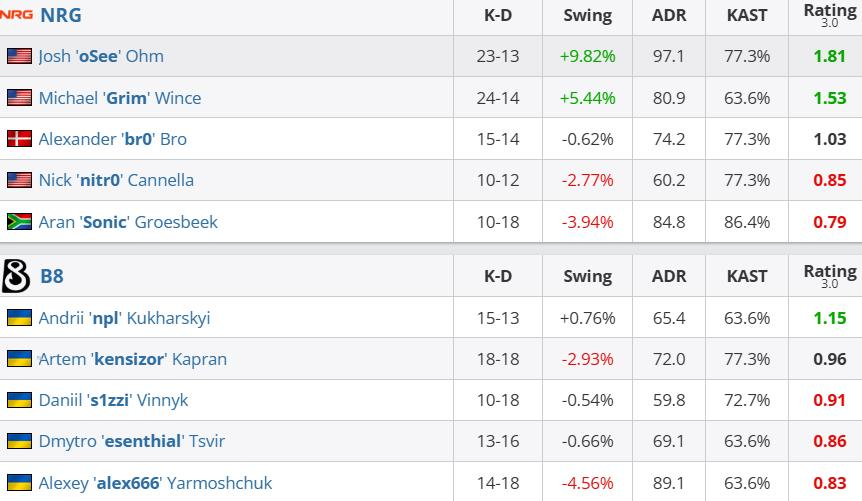 个人数据方面,oSee和Grim火力全开,分别拿到14次击杀,1.41的rating和18次击杀,1.32的rating,NRG全队火力全开,全员Rating超过1.0。反观B8,仅有alex666和npl状态较好,alex666拿到15次击杀和94.0的ADR,npl则拿到13次击杀和82.8的ADR。