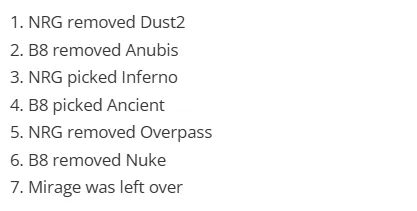 NRG禁用Dust2,B8禁用Anubis