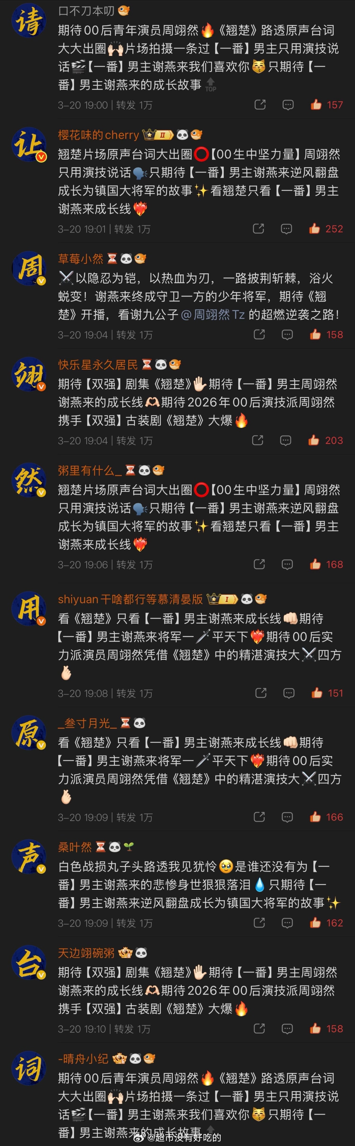 周翊然粉丝《翘楚》热🧱排字来了要求周翊然角色谢燕来要原声台词 骤然江湖原声被很