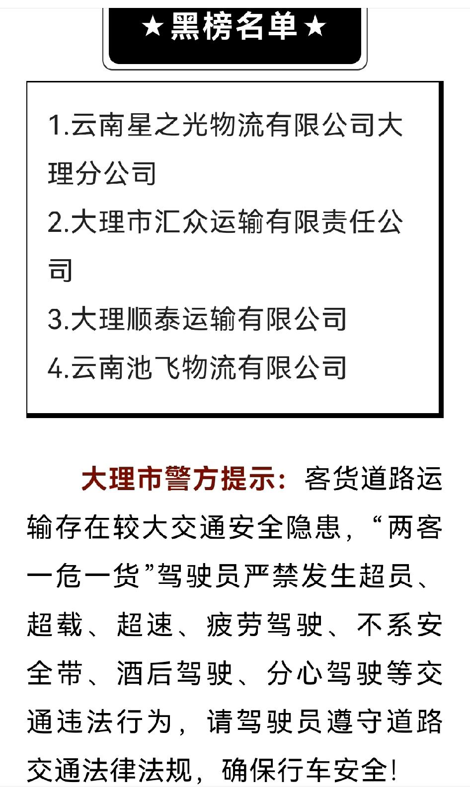 大理这“两客一危一货”运输企业红黑榜发布得太有必要了!交通出行安全一直是大家关注的重点,建立这个红黑排行榜,能很好地推动运输企业落实交通安全主体责任。 3月份的榜单中,那些零交通违法的优良运输企业值得表扬,它们为交通安全树立了榜样,让乘客和货物运输更有保障。而那些交通违法较多的企业被曝光,也给它们敲响了警钟。 这就像一场比赛,遵守规则的企业在红榜闪耀,违规的企业则上了黑榜。希望上榜黑榜的企业能痛定思痛,向红榜企业学习,大家一起为大理的交通安全出份力! 现将3月份全市“两客一危一货”运输企业“红黑榜”公布如下 大货车